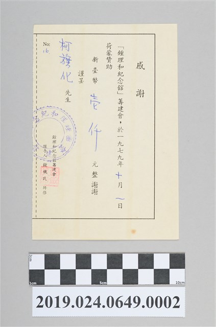 2019.024.0649.0002 鐘理和紀念館寄柯旗化贊助籌建證明信紙