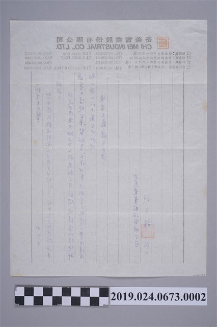 1992年9月9日許文龍寫給柯旗化的信件,內容為向柯旗化訂購50本日文版《台灣監獄島》供前來的日本客戶閱讀,存放在信封內。許文龍為奇美集團創辦人過去與柯旗化一樣,十分投入地本土文化事業而相互結識,也在國內外媒體公開讚賞柯旗化於台灣獨立事業上的努力與成就,學習銅像創作的他也替柯旗化製作人型銅像(今放置於柯旗化故居)紀念,私下曾有多次書信來往,更在柯旗化逝世時擔任治喪委員會的主委,可見兩人交情斐淺。