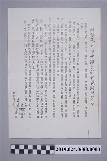2019.024.0680.0003 柯旗化政治受難會辭職聲明之影本