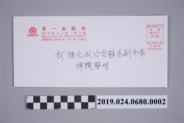 2019.024.0680.0002 柯旗化政治受難會辭職聲明影本信封