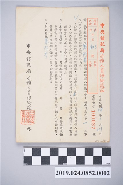 蔡阿李公務人員改保險函,1969年1月21日由中央信託局公務人員保險處寄出,因蔡阿李因病離職一事想要將公務人員保險改成保個人保險,但此函回覆通知目前公務人員保險改保個人保險的辦法,國內尚未訂定施行,目前僅能先為存記,等到相關辦法訂定施行時在按其規定處理,目前就先停保,不續繳費也暫停任何保險權益,參考後來保險卡原件背後的註記,中央信託局准予保險年資保留五年,共一張,有對折的痕跡。