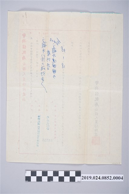 蔡阿李收藏之1969年1月31日保留公務人員保險年資公文,蔡阿李於1968年10月30日因病向高雄市政府提出辭職,請辭前金國民小學教員一職,因此隔年1969年1月18日蔡阿李向中央保險局公務人員保險處提出保留公務人員保險年資的申請,此文件為中央保險局公務人員保險處的回覆公文,表示與規定相符,業已照辦,另外附送原始保險卡給蔡阿李留存,留為未來復職時可恢復保險用,全公文共一張,並用迴紋針夾帶蔡阿李公務人員保險卡一張,上頭註記保險年資准予保留五年,文物照原進館狀態折疊存放。