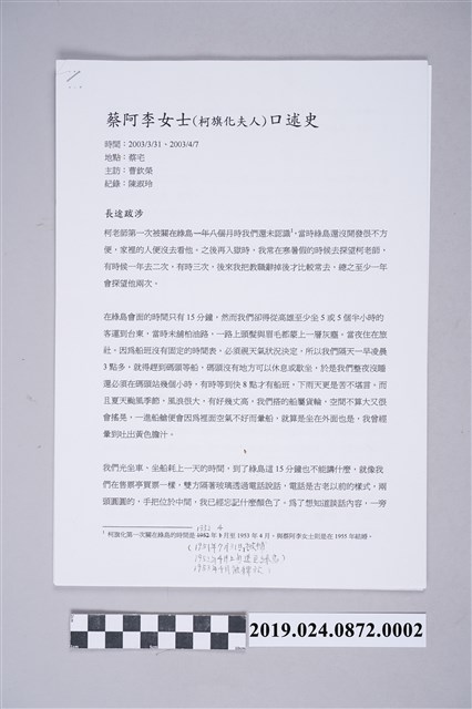 2019.024.0872.0002 曹欽榮訪談柯蔡阿李女士口述歷史初稿之內容