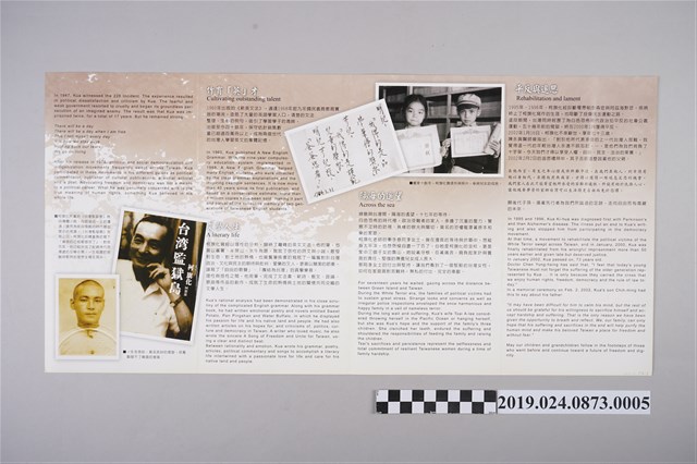 1.先行者的足跡柯旗化的一生特展手冊,於2005年12月印製,主辦單位為高雄市立博歷史博物館,展覽期間為2005年12月27日至2006年4月2日,展覽於該館第三展覽室,手冊採折疊方式,內容包括柯旗化的生命時序分別介紹其學生生活、對二二八事件親眼見證的衝擊、出獄後的文學創作、新英文法的教科書傳奇等等,當時展覽搶先於2005年12月開展,而開幕式儀式則於隔年2006年元旦舉行,也邀請到柯旗化的太太柯蔡阿李前往致詞。另外,相同的展覽內容於2008年被當時行政院文化建設委員會移展至綠島文化園區的綠洲山莊戒護中心展出。此資料袋中共有17份相同的手冊,用橡皮筋綑在一起。2.柯蔡阿李在柯旗化逝世後,積極地在媒體上受訪發聲,也保存所有參加人權、柯旗化相關活動等報導與文件,柯蔡阿李收藏這類的收藏相當完整,對柯蔡阿李而言,突破沉默是對柯旗化理念最好的見證與傳遞,也是她對於已逝的丈夫的一種紀念,透過蔡阿李這些鉅細靡遺的收藏,也印證了一位女性政治受難者生命史的歷程。
