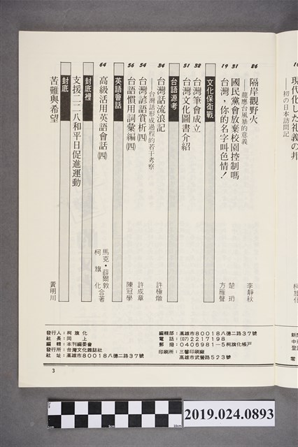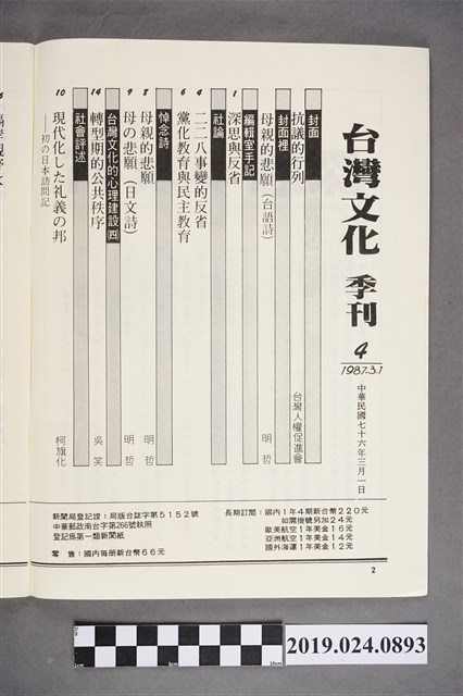 1.1987年3月1日台灣文化雜誌社發行《台灣文化季刊Formosan Culture 1987.3.1 出版第4期》本刊為第四刊,本刊也遭警備總部檢舉而查禁。