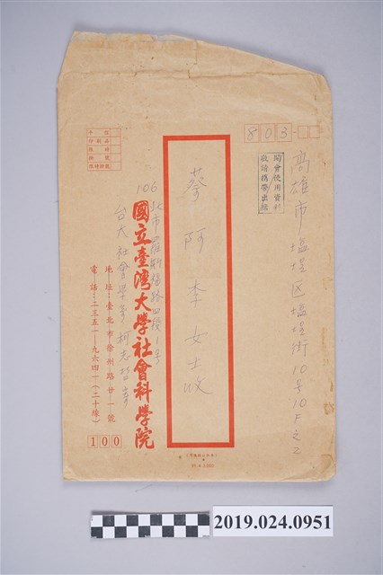 2019.024.0951 柯志明寄柯蔡阿李之臺大社科院信封