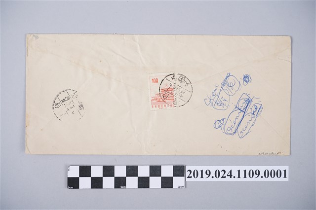 本文物為1969年11月10日柯旗化獄中家書之信封,柯旗化第二次入獄時期(1961年到1976年)從獄中寄回家給柯蔡阿李及其親屬之信件,信件內容主要包括《新英文法》增補改訂的編輯工作、讀者回函以及對家人親屬的問候,由於柯旗化寫信時仍於監獄中,寄出的信件往往有字數限制,內容上也必須受到檢查。此文物於2007年時由柯蔡阿李女士委託本館進行《獄中家書:柯旗化坐監書信集》編輯出版工作,並於2010年將信件全文完成出版,2017年柯蔡阿李女士希望透過捐贈的方式將這批原先暫存於本館庫房的文物進入博物館典藏中。有別於過去戒嚴時期政治司法案件以解讀檔案建構歷史的形態,柯旗化的坐監書信集中當事人與其家屬的互動則提供了更常民、生活化的面向來理解這段歷史。紙張保存狀況尚完整,但已泛黃。