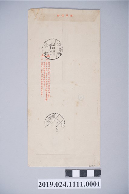本文物為1969年12月30日柯旗化獄中家書之信封,柯旗化第二次入獄時期(1961年到1976年)從獄中寄回家給柯蔡阿李及其親屬之信件,信件內容主要包括《新英文法》增補改訂的編輯工作、讀者回函以及對家人親屬的問候,由於柯旗化寫信時仍於監獄中,寄出的信件往往有字數限制,內容上也必須受到檢查。此文物於2007年時由柯蔡阿李女士委託本館進行《獄中家書:柯旗化坐監書信集》編輯出版工作,並於2010年將信件全文完成出版,2017年柯蔡阿李女士希望透過捐贈的方式將這批原先暫存於本館庫房的文物進入博物館典藏中。有別於過去戒嚴時期政治司法案件以解讀檔案建構歷史的形態,柯旗化的坐監書信集中當事人與其家屬的互動則提供了更常民、生活化的面向來理解這段歷史。紙張保存狀況尚完整,但已泛黃。