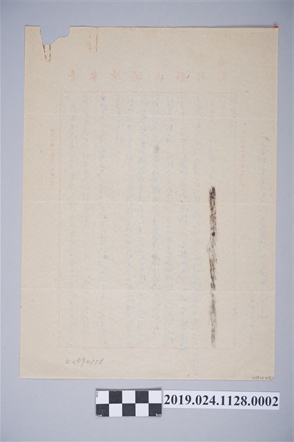 本文物為1971年2月1日柯旗化獄中家書之內容,柯旗化第二次入獄時期(1961年到1976年)從獄中寄回家給柯蔡阿李及其親屬之信件,信件內容主要包括《新英文法》增補改訂的編輯工作、讀者回函以及對家人親屬的問候,由於柯旗化寫信時仍於監獄中,寄出的信件往往有字數限制,內容上也必須受到檢查。此文物於2007年時由柯蔡阿李女士委託本館進行《獄中家書:柯旗化坐監書信集》編輯出版工作,並於2010年將信件全文完成出版,2017年柯蔡阿李女士希望透過捐贈的方式將這批原先暫存於本館庫房的文物進入博物館典藏中。有別於過去戒嚴時期政治司法案件以解讀檔案建構歷史的形態,柯旗化的坐監書信集中當事人與其家屬的互動則提供了更常民、生活化的面向來理解這段歷史。紙張保存狀況尚完整,但已泛黃。