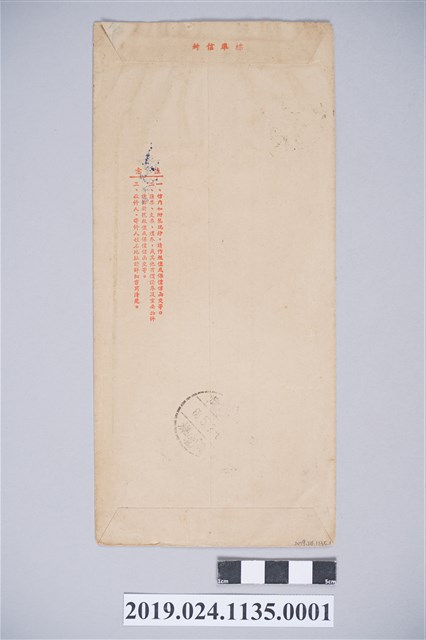 本文物為1971年4月26日柯旗化獄中家書之信封,柯旗化第二次入獄時期(1961年到1976年)從獄中寄回家給柯蔡阿李及其親屬之信件,信件內容主要包括《新英文法》增補改訂的編輯工作、讀者回函以及對家人親屬的問候,由於柯旗化寫信時仍於監獄中,寄出的信件往往有字數限制,內容上也必須受到檢查。此文物於2007年時由柯蔡阿李女士委託本館進行《獄中家書:柯旗化坐監書信集》編輯出版工作,並於2010年將信件全文完成出版,2017年柯蔡阿李女士希望透過捐贈的方式將這批原先暫存於本館庫房的文物進入博物館典藏中。有別於過去戒嚴時期政治司法案件以解讀檔案建構歷史的形態,柯旗化的坐監書信集中當事人與其家屬的互動則提供了更常民、生活化的面向來理解這段歷史。紙張保存狀況尚完整,但已泛黃。
