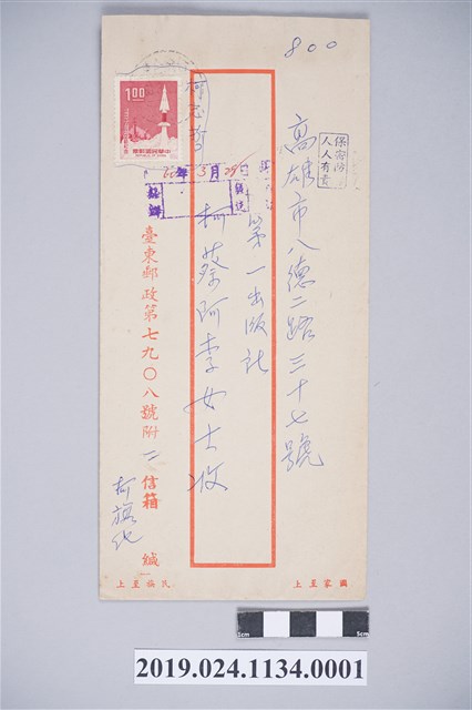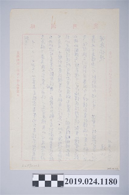 本文物為1973年7月16日柯旗化獄中家書,柯旗化第二次入獄時期(1961年到1976年)從獄中寄回家給柯蔡阿李及其親屬之信件,信件內容主要包括《新英文法》增補改訂的編輯工作、讀者回函以及對家人親屬的問候,由於柯旗化寫信時仍於監獄中,寄出的信件往往有字數限制,內容上也必須受到檢查。此文物於2007年時由柯蔡阿李女士委託本館進行《獄中家書:柯旗化坐監書信集》編輯出版工作,並於2010年將信件全文完成出版,2017年柯蔡阿李女士希望透過捐贈的方式將這批原先暫存於本館庫房的文物進入博物館典藏中。有別於過去戒嚴時期政治司法案件以解讀檔案建構歷史的形態,柯旗化的坐監書信集中當事人與其家屬的互動則提供了更常民、生活化的面向來理解這段歷史。紙張保存狀況尚完整,但已泛黃。