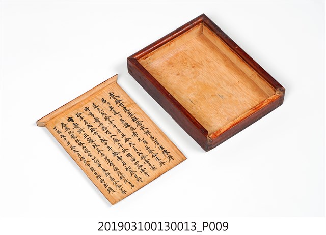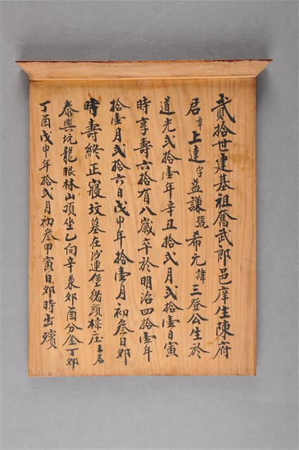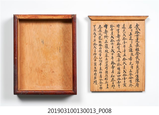 文物外盒蓋內側撰有陳上達生平概要,註明陳上達名號,述及為道光21年生,享壽68歲於明治41年過世,墓在沙連堡豬頭棕庄,約位於今竹山桂林里附近山區。不過,據《竹山鎮志》所述陳上達生年為道光29年,卒日也略有出入。