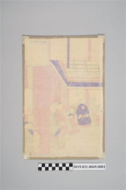 1.大蘓芳年繪《大日本辦理大臣支那於北京臺灣㕝件議決之圖》版畫右側,單面彩色印刷木版畫,即所謂浮世繪中的「錦繪」,全圖總共由3張繪紙接續拼成,本件屬全圖右側的段落。本圖內容描繪1874年牡丹社事件發生後約半年,日本和中國雙方於北京簽訂「北京專約」的場景。本段落畫面表現北京官員有些坐在高椅上,有些席地而坐參與會議。整體畫面由前至後繪竹簾和中國宮殿的高聳紅柱、華麗的宮殿天花板與排列在牆邊的中國官員,最後是大殿後的金屏風。版畫右上角附本圖標題「大日本辦理大臣支那於北京臺灣㕝(事)件議決之圖」,右圖邊緣有繪師「雪齋大蘓芳年」之名款,右下角標記出源自日本東京日本橋通二丁目的出版商「丸屋鉄治郎」,以及「渡辺彫栄」之名。