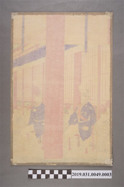 1. 本件是大蘓芳年繪《大日本辦理大臣支那於北京臺灣㕝件議決之圖》版畫左側,單面彩色印刷木版畫,即所謂浮世繪中的「錦繪」,全圖總共由3張印刷版畫拼接而成,本件屬中間的段落。本圖內容描繪1874年牡丹社事件發生後約半年,日本和中國雙方於北京簽訂「北京專約」的場景。本段落主要畫面內容是日方使節或坐在高椅、或席地而坐參與專約簽署的樣子,從史實來看,畫面中列席的日本代表即是被日方政府賦予此事件交涉全權的大臣——大久保利通。整體畫面由前至後描繪出具有龜甲花紋的竹簾、中國宮殿的高聳紅柱、華麗的宮殿窗櫺,與穿著西式正軍裝的日本軍官。2. 本圖的主題屬於浮世繪中的「錦繪新聞」類型。浮世繪起源自江戶時期的城市,並隨著城市發展逐漸成熟、蓬勃。浮世繪作品與城市中的庶民文化生活密不可分,在題材上,以描繪城市生活的美人繪、役者繪是常見的創作主題。然而到了明治時期,西方文化進入日本,寫真技術、石版、銅板印刷的傳入為浮世繪界帶來衝擊。不過,浮世繪產業並未衰弱,為了因應時勢變化,浮世繪繪師開始開發新的題材,包括「橫濱繪」和「錦繪新聞」,尤其是錦繪新聞題材憑藉浮世繪戲劇性、富有張力的畫面表現,成功和具有寫實特質的攝影技術競爭,為浮世繪師帶來商機。本件版畫所描繪的即是日本明治時期浮世繪新興的「錦繪新聞」版畫,可以推知本圖創作時間約在北京專約簽署後、牡丹社事件落幕後不久。