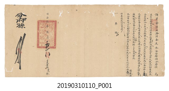 同治玖年陸月初六調署臺灣北路理蕃鹿港海防總捕分府文件