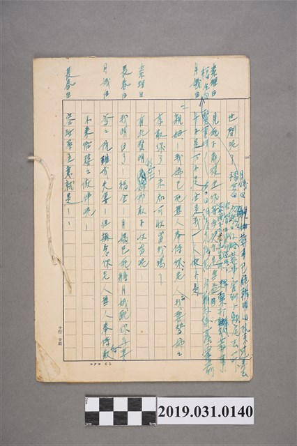李臨秋於戰後編寫的劇本。稿紙為「臺北近郊乘合自動車株式會社」印製出品,李臨秋1942年至1947年間任職於該公司擔任會計事務。本手稿為戰後初期劇本原稿,別具歌謠史與戲劇史價值。