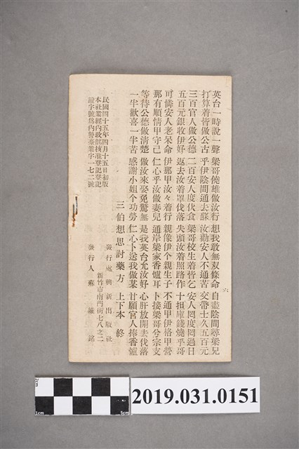 2019.031.0151 《三伯想思討葯方上下本》歌本