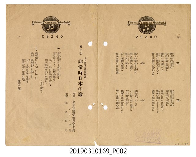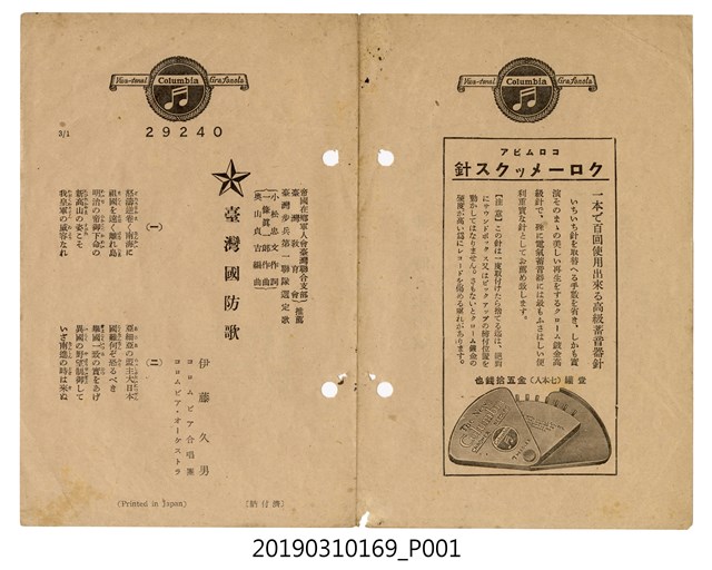 日治時期唱片所附歌單,內容為日文戰時宣傳歌