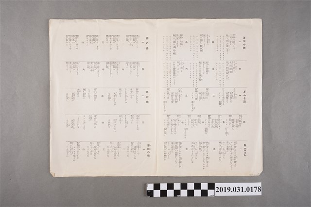 日治時期歌詞集出版品,內容為1929年臺灣的歌選拔成果,有蓬萊小呗、どんと節等等歌曲。