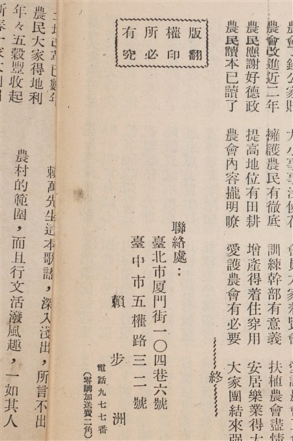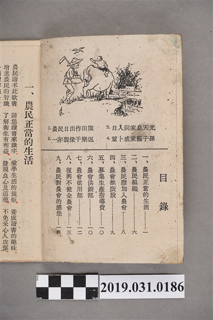 戰後初期歌本出版品,鍾萬編撰、馬有岳1955年10月文。為七字仔歌謠宣傳品,提到農民生活須知、應加入農會、農會推廣股介紹等。