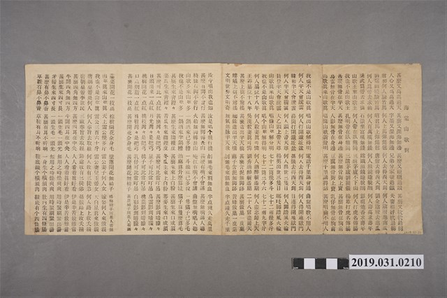 單張歌謠印刷,善化堂書局印行。刊印許多謎猜內容,另一面為七字仔歌謠。