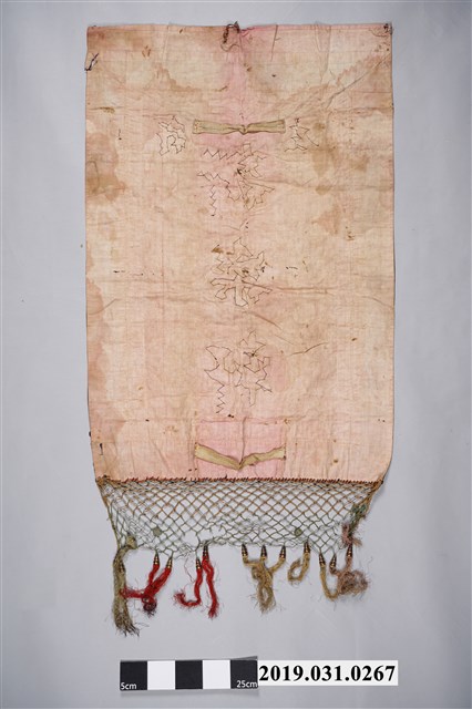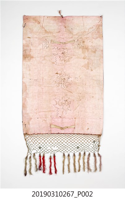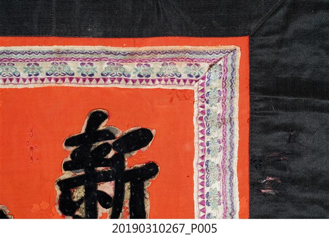 1. 本件為南投草屯鎮新庄新樂軒錦旗,整體成上下邊窄、左右邊寬的長方形,頂端留有白邊一條,用以懸掛固定錦旗。主要旗面外有一周深藍邊布,內為紅色旗面,外鏽一週白底紫藍紅花邊,中心由上而下鏽有「新樂軒」三大字,其上額另鏽有橫書「新庄」二字。旗面下有網狀旗穗,尾端繫有多個金屬葫蘆與紅色穗尾。錦旗背面保持白色素面,沒有任何裝飾。2. 新庄新樂軒是位於南投草屯鎮新庄(今該鎮新庄里、北投里一帶)的傳統曲館,相傳約在清同治5年(1866)由新庄人洪高知創立,後洪蕃薯繼任總理,之後為洪廷魁接任。成立之始曲館設置在新庄洪氏燉煌堂中,為訓練成員,特別聘請彰化集樂軒林文燦前來教授排場與步法、鹿港施萬生傳授北曲與演奏。後因燉煌堂改建,遷移至新月橋旁之洪廷魁自宅中,是臺灣中部相當具有歷史的曲館,此錦旗即該曲館表演使用之旗幟。3. 臺灣傳統農村社會中,常有地方子弟利用農閒練習樂器演奏、陣頭與戲曲表演,在地方年節時參與廟會喜慶參與演出,稱之為子弟戲、曲館等,其中臺灣中部以演奏北管為多。草屯鎮的地方曲館起源自清代,在1945年前後達到鼎盛,當時計有御使里永樂軒、上林里眾樂軒、碧峰里昭樂軒、加老里勝樂軒、新庄里新樂軒、致和里和春園、中原里和梨園以及南埔的大鼓陣南勝團等。1969年後,隨著新式娛樂的電影、電視等之興起,草屯的傳統樂團曲館經濟日益困難,成員老化,演出稀少,因而逐漸沒落。