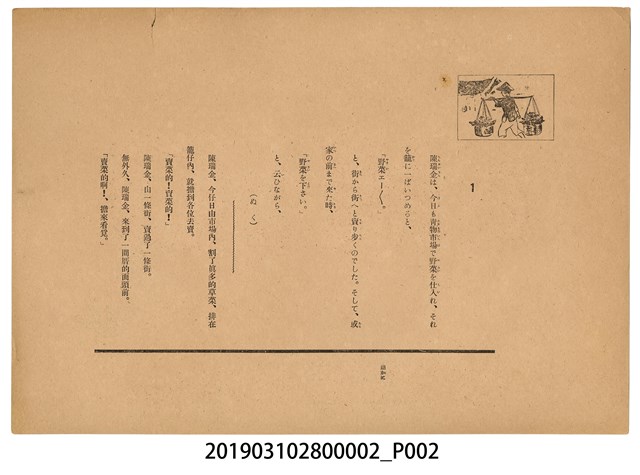 1.本物件為臺灣紙芝居協會的《口之禍》紙芝居(按:連環圖紙話劇)。為紙製材質,除了封面和封底,主要故事有5張。封面底色為淡綠色,上方寫著「流言斐語防止紙芝居」,中間寫著「口の禍ひ」(按:禍從口出),下方寫著「臺灣紙芝居協會」。第1張是肩膀挑著一擔菜的小販圖案,背面附有日文和中文說明。第2張是兩位男子與一個女子在一個小吃攤上喝酒閒聊,背面附有日文和中文說明。第3張是一位青年和一位警察在一位男子經營的小吃攤前說話,背面附有日文和中文說明。第4張是一位手拿鋤頭的中年婦女和一位手拿雞蛋和行李的中年婦女擦身而過,旁邊有一隻公雞,背面附有日文和中文說明。第5張是一個日本國旗和一個綠色的臺灣,臺灣上寫著「臺灣一家」,背面附有日文和中文說明。封底則是出版資訊,載其為昭和16年出版,發行單位為臺灣紙芝居協會。