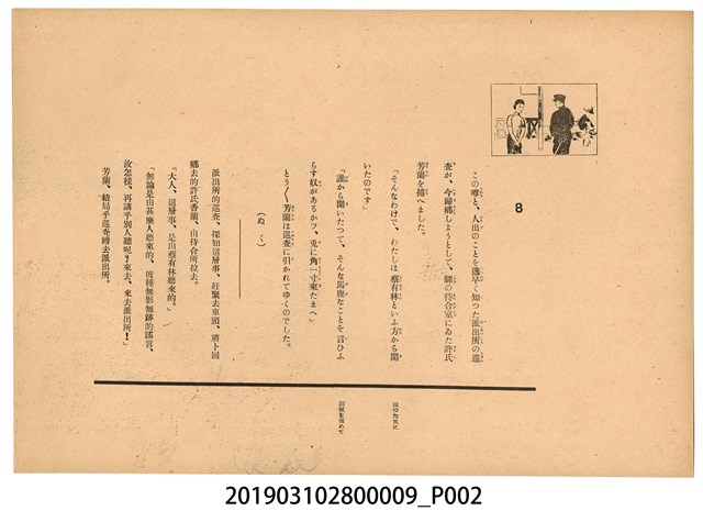 1.本物件為臺灣紙芝居協會的《口之禍》紙芝居(按:連環圖紙話劇)。為紙製材質,除了封面和封底,主要故事有5張。封面底色為淡綠色,上方寫著「流言斐語防止紙芝居」,中間寫著「口の禍ひ」(按:禍從口出),下方寫著「臺灣紙芝居協會」。第1張是肩膀挑著一擔菜的小販圖案,背面附有日文和中文說明。第2張是兩位男子與一個女子在一個小吃攤上喝酒閒聊,背面附有日文和中文說明。第3張是一位青年和一位警察在一位男子經營的小吃攤前說話,背面附有日文和中文說明。第4張是一位手拿鋤頭的中年婦女和一位手拿雞蛋和行李的中年婦女擦身而過,旁邊有一隻公雞,背面附有日文和中文說明。第5張是一個日本國旗和一個綠色的臺灣,臺灣上寫著「臺灣一家」,背面附有日文和中文說明。封底則是出版資訊,載其為昭和16年出版,發行單位為臺灣紙芝居協會。