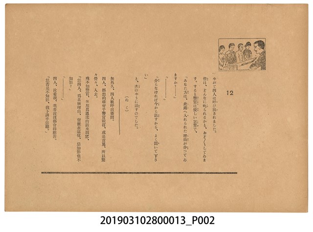 1.本物件為臺灣紙芝居協會的《口之禍》紙芝居(按:連環圖紙話劇)。為紙製材質,除了封面和封底,主要故事有5張。封面底色為淡綠色,上方寫著「流言斐語防止紙芝居」,中間寫著「口の禍ひ」(按:禍從口出),下方寫著「臺灣紙芝居協會」。第1張是肩膀挑著一擔菜的小販圖案,背面附有日文和中文說明。第2張是兩位男子與一個女子在一個小吃攤上喝酒閒聊,背面附有日文和中文說明。第3張是一位青年和一位警察在一位男子經營的小吃攤前說話,背面附有日文和中文說明。第4張是一位手拿鋤頭的中年婦女和一位手拿雞蛋和行李的中年婦女擦身而過,旁邊有一隻公雞,背面附有日文和中文說明。第5張是一個日本國旗和一個綠色的臺灣,臺灣上寫著「臺灣一家」,背面附有日文和中文說明。封底則是出版資訊,載其為昭和16年出版,發行單位為臺灣紙芝居協會。