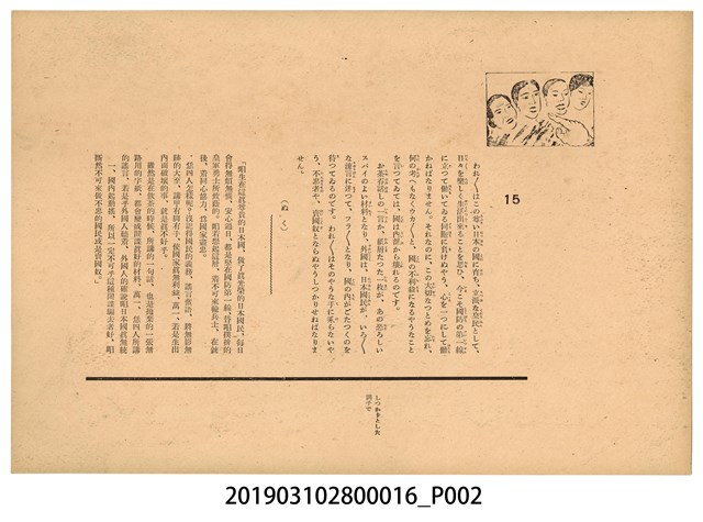1.本物件為臺灣紙芝居協會的《口之禍》紙芝居(按:連環圖紙話劇)。為紙製材質,除了封面和封底,主要故事有5張。封面底色為淡綠色,上方寫著「流言斐語防止紙芝居」,中間寫著「口の禍ひ」(按:禍從口出),下方寫著「臺灣紙芝居協會」。第1張是肩膀挑著一擔菜的小販圖案,背面附有日文和中文說明。第2張是兩位男子與一個女子在一個小吃攤上喝酒閒聊,背面附有日文和中文說明。第3張是一位青年和一位警察在一位男子經營的小吃攤前說話,背面附有日文和中文說明。第4張是一位手拿鋤頭的中年婦女和一位手拿雞蛋和行李的中年婦女擦身而過,旁邊有一隻公雞,背面附有日文和中文說明。第5張是一個日本國旗和一個綠色的臺灣,臺灣上寫著「臺灣一家」,背面附有日文和中文說明。封底則是出版資訊,載其為昭和16年出版,發行單位為臺灣紙芝居協會。