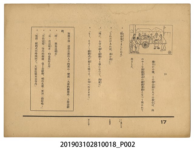 1.本物件為大日本畫劇株式會社的《真心的出征》紙芝居(按:連環圖紙話劇)。為紙製材質,除了封面,共有6張。封面畫有在樹林裡遠眺的兒童,上面寫著「真心の出征」,下方寫著「大日本畫劇株式會社」。第1張的場景是在教室裡,有10為學生在上書法課,背面附有日文和臺語說明。第2張則是一位穿著淡藍色洋裝的老師走過來與學生談話,背面附有日文和臺語說明。第3張是在一間和室房間內,一位穿著浴衣的男子拿著說明書,對著一群採坐姿的男女老幼談話,背面附有日文和臺語說明。第4張是一位穿著澄色上衣孩童,拿著一個長型物品仔細端詳,背面附有日文和臺語說明。第5張是眾人圍繞著一位推著手推車的男子,手推車上面滿載著資源,背面附有日文和臺語說明。第6張是小男孩緊抓著一位僧侶的手,兩人一起拿著鐘把,正準備敲鐘,背面附有日文和臺語說明。2.日本在1920年代,街頭賣糖果零食的商人以紙芝居演出作為招攬生意的方法,大受兒童歡迎,因此紙芝居團在日本快速興起,至1930年代為黃金時代,這股風氣也影響至臺灣。日本教育學者一方面擔憂紙芝居的譁眾取向會對兒童有壞的影響,一方面又看好其啟迪民眾的效用,因而推動紙芝居教材之製作及應用於教學。紙芝居最初運用於幼稚園及低年級教學,內容以童話故事為主。1941年,皇民奉公會附屬團體臺灣紙芝居協會成立,各地亦紛紛設立紙芝居研究會,紙芝居成為皇民化時期宣傳國策的利器,舉凡戰爭動員、鼓勵增產、儲蓄報國等,均一一成為紙芝居演出的主題。