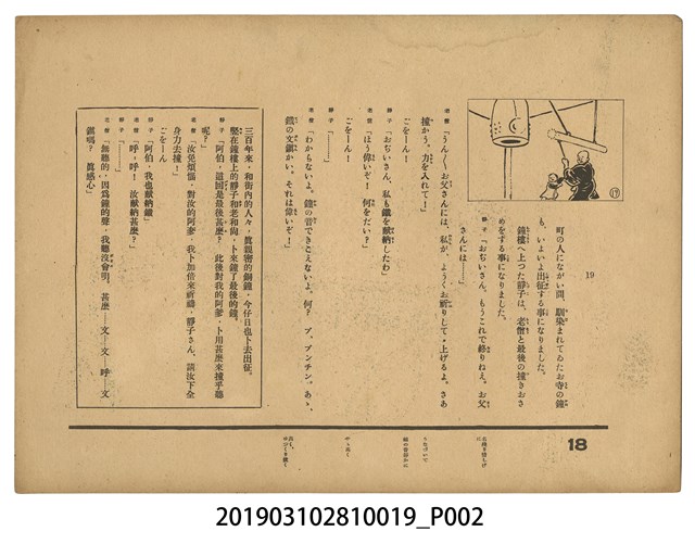 1.本物件為大日本畫劇株式會社的《真心的出征》紙芝居(按:連環圖紙話劇)。為紙製材質,除了封面,共有6張。封面畫有在樹林裡遠眺的兒童,上面寫著「真心の出征」,下方寫著「大日本畫劇株式會社」。第1張的場景是在教室裡,有10為學生在上書法課,背面附有日文和臺語說明。第2張則是一位穿著淡藍色洋裝的老師走過來與學生談話,背面附有日文和臺語說明。第3張是在一間和室房間內,一位穿著浴衣的男子拿著說明書,對著一群採坐姿的男女老幼談話,背面附有日文和臺語說明。第4張是一位穿著澄色上衣孩童,拿著一個長型物品仔細端詳,背面附有日文和臺語說明。第5張是眾人圍繞著一位推著手推車的男子,手推車上面滿載著資源,背面附有日文和臺語說明。第6張是小男孩緊抓著一位僧侶的手,兩人一起拿著鐘把,正準備敲鐘,背面附有日文和臺語說明。2.日本在1920年代,街頭賣糖果零食的商人以紙芝居演出作為招攬生意的方法,大受兒童歡迎,因此紙芝居團在日本快速興起,至1930年代為黃金時代,這股風氣也影響至臺灣。日本教育學者一方面擔憂紙芝居的譁眾取向會對兒童有壞的影響,一方面又看好其啟迪民眾的效用,因而推動紙芝居教材之製作及應用於教學。紙芝居最初運用於幼稚園及低年級教學,內容以童話故事為主。1941年,皇民奉公會附屬團體臺灣紙芝居協會成立,各地亦紛紛設立紙芝居研究會,紙芝居成為皇民化時期宣傳國策的利器,舉凡戰爭動員、鼓勵增產、儲蓄報國等,均一一成為紙芝居演出的主題。