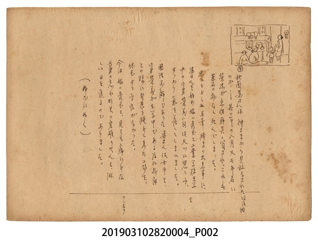 1.本物件為林德正《母子的誓言》紙芝居(按:連環圖紙話劇)。材質為紙類,有封套,共五張。封套上寫著林德正,母子の誓ひ,自作話劇,20枚,皇紀2603年8月31日(按:1943年8月31日)。第1張是畫有1對母子,及農具製造工場工場,背面為圖片故事,背面說明大東亞戰爭發生時,青年陳秋菌與母親的約定。第2張畫有工場的樣子,寫著該工場為瑞東農具工場。背面則說明該工場為陳瑞東父子經營,為了糧食生產而努力製造農具。第3張畫有一位老師和一位老婆婆。背面說明老師以國語(日文)跟老婆婆交談。第4張是老師在課堂教授國語的樣子。背面說明老婆婆認為不管時局多麼艱難,還是持續來上國語課。第5張為老婆婆和他的兒子在工場裡談話。背面說明他們堅持著食糧增產的信念。