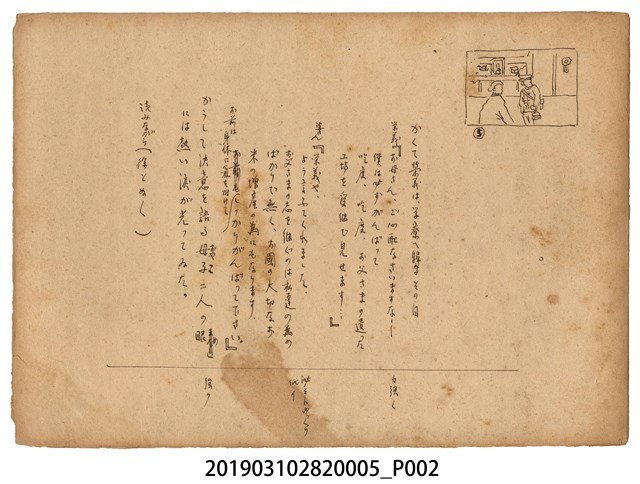 1.本物件為林德正《母子的誓言》紙芝居(按:連環圖紙話劇)。材質為紙類,有封套,共五張。封套上寫著林德正,母子の誓ひ,自作話劇,20枚,皇紀2603年8月31日(按:1943年8月31日)。第1張是畫有1對母子,及農具製造工場工場,背面為圖片故事,背面說明大東亞戰爭發生時,青年陳秋菌與母親的約定。第2張畫有工場的樣子,寫著該工場為瑞東農具工場。背面則說明該工場為陳瑞東父子經營,為了糧食生產而努力製造農具。第3張畫有一位老師和一位老婆婆。背面說明老師以國語(日文)跟老婆婆交談。第4張是老師在課堂教授國語的樣子。背面說明老婆婆認為不管時局多麼艱難,還是持續來上國語課。第5張為老婆婆和他的兒子在工場裡談話。背面說明他們堅持著食糧增產的信念。2.大東亞戰爭是日本對第二次大戰在遠東和太平洋戰場的戰爭總稱,戰爭目的在建立以日本為中心的「大東亞共榮圈」。此用語是在1941年12月珍珠港事變爆發後確定,戰後被駐日盟軍總司令部視為「戰爭用語」,而禁止使用。3.日本在1920年代,街頭賣糖果零食的商人以紙芝居演出作為招攬生意的方法,大受兒童歡迎,因此紙芝居團在日本快速興起,至1930年代為黃金時代,這股風氣也影響至臺灣。日本教育學者一方面擔憂紙芝居的譁眾取向會對兒童有壞的影響,一方面又看好其啟迪民眾的效用,因而推動紙芝居教材之製作及應用於教學。紙芝居最初運用於幼稚園及低年級教學,內容以童話故事為主。1941年,皇民奉公會附屬團體臺灣紙芝居協會成立,各地亦紛紛設立紙芝居研究會,紙芝居成為皇民化時期宣傳國策的利器,舉凡戰爭動員、鼓勵增產、儲蓄報國等,均一一成為紙芝居演出的主題。
