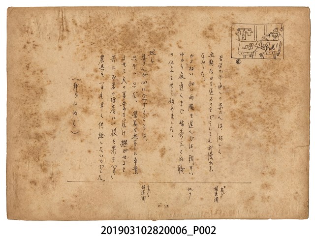 1.本物件為林德正《母子的誓言》紙芝居(按:連環圖紙話劇)。材質為紙類,有封套,共五張。封套上寫著林德正,母子の誓ひ,自作話劇,20枚,皇紀2603年8月31日(按:1943年8月31日)。第1張是畫有1對母子,及農具製造工場工場,背面為圖片故事,背面說明大東亞戰爭發生時,青年陳秋菌與母親的約定。第2張畫有工場的樣子,寫著該工場為瑞東農具工場。背面則說明該工場為陳瑞東父子經營,為了糧食生產而努力製造農具。第3張畫有一位老師和一位老婆婆。背面說明老師以國語(日文)跟老婆婆交談。第4張是老師在課堂教授國語的樣子。背面說明老婆婆認為不管時局多麼艱難,還是持續來上國語課。第5張為老婆婆和他的兒子在工場裡談話。背面說明他們堅持著食糧增產的信念。2.大東亞戰爭是日本對第二次大戰在遠東和太平洋戰場的戰爭總稱,戰爭目的在建立以日本為中心的「大東亞共榮圈」。此用語是在1941年12月珍珠港事變爆發後確定,戰後被駐日盟軍總司令部視為「戰爭用語」,而禁止使用。3.日本在1920年代,街頭賣糖果零食的商人以紙芝居演出作為招攬生意的方法,大受兒童歡迎,因此紙芝居團在日本快速興起,至1930年代為黃金時代,這股風氣也影響至臺灣。日本教育學者一方面擔憂紙芝居的譁眾取向會對兒童有壞的影響,一方面又看好其啟迪民眾的效用,因而推動紙芝居教材之製作及應用於教學。紙芝居最初運用於幼稚園及低年級教學,內容以童話故事為主。1941年,皇民奉公會附屬團體臺灣紙芝居協會成立,各地亦紛紛設立紙芝居研究會,紙芝居成為皇民化時期宣傳國策的利器,舉凡戰爭動員、鼓勵增產、儲蓄報國等,均一一成為紙芝居演出的主題。