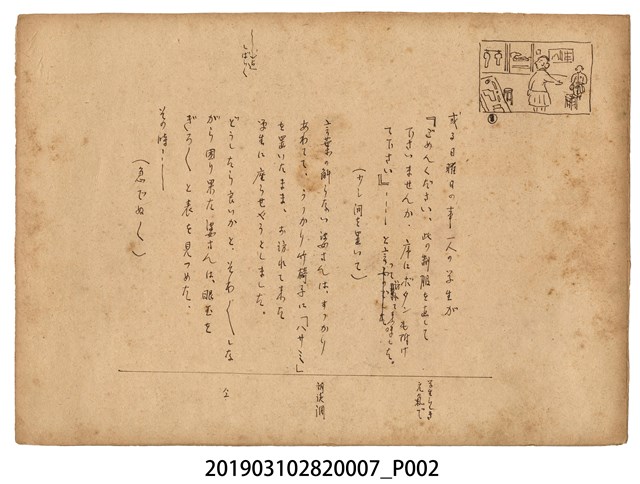 1.本物件為林德正《母子的誓言》紙芝居(按:連環圖紙話劇)。材質為紙類,有封套,共五張。封套上寫著林德正,母子の誓ひ,自作話劇,20枚,皇紀2603年8月31日(按:1943年8月31日)。第1張是畫有1對母子,及農具製造工場工場,背面為圖片故事,背面說明大東亞戰爭發生時,青年陳秋菌與母親的約定。第2張畫有工場的樣子,寫著該工場為瑞東農具工場。背面則說明該工場為陳瑞東父子經營,為了糧食生產而努力製造農具。第3張畫有一位老師和一位老婆婆。背面說明老師以國語(日文)跟老婆婆交談。第4張是老師在課堂教授國語的樣子。背面說明老婆婆認為不管時局多麼艱難,還是持續來上國語課。第5張為老婆婆和他的兒子在工場裡談話。背面說明他們堅持著食糧增產的信念。2.大東亞戰爭是日本對第二次大戰在遠東和太平洋戰場的戰爭總稱,戰爭目的在建立以日本為中心的「大東亞共榮圈」。此用語是在1941年12月珍珠港事變爆發後確定,戰後被駐日盟軍總司令部視為「戰爭用語」,而禁止使用。3.日本在1920年代,街頭賣糖果零食的商人以紙芝居演出作為招攬生意的方法,大受兒童歡迎,因此紙芝居團在日本快速興起,至1930年代為黃金時代,這股風氣也影響至臺灣。日本教育學者一方面擔憂紙芝居的譁眾取向會對兒童有壞的影響,一方面又看好其啟迪民眾的效用,因而推動紙芝居教材之製作及應用於教學。紙芝居最初運用於幼稚園及低年級教學,內容以童話故事為主。1941年,皇民奉公會附屬團體臺灣紙芝居協會成立,各地亦紛紛設立紙芝居研究會,紙芝居成為皇民化時期宣傳國策的利器,舉凡戰爭動員、鼓勵增產、儲蓄報國等,均一一成為紙芝居演出的主題。