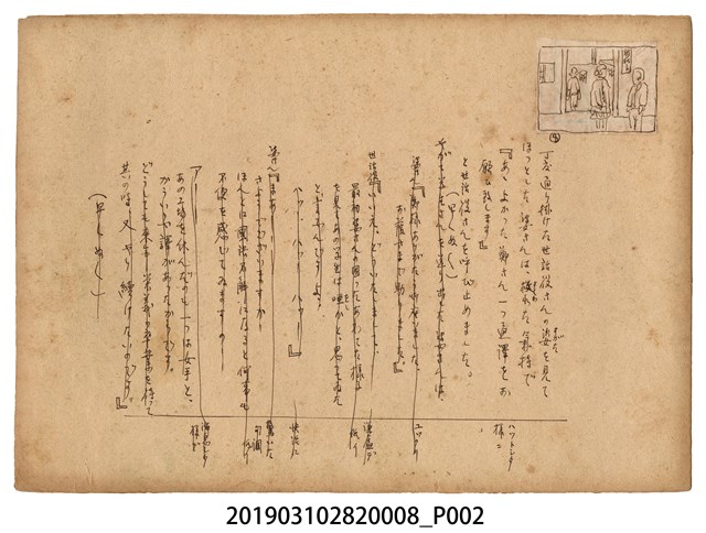 1.本物件為林德正《母子的誓言》紙芝居(按:連環圖紙話劇)。材質為紙類,有封套,共五張。封套上寫著林德正,母子の誓ひ,自作話劇,20枚,皇紀2603年8月31日(按:1943年8月31日)。第1張是畫有1對母子,及農具製造工場工場,背面為圖片故事,背面說明大東亞戰爭發生時,青年陳秋菌與母親的約定。第2張畫有工場的樣子,寫著該工場為瑞東農具工場。背面則說明該工場為陳瑞東父子經營,為了糧食生產而努力製造農具。第3張畫有一位老師和一位老婆婆。背面說明老師以國語(日文)跟老婆婆交談。第4張是老師在課堂教授國語的樣子。背面說明老婆婆認為不管時局多麼艱難,還是持續來上國語課。第5張為老婆婆和他的兒子在工場裡談話。背面說明他們堅持著食糧增產的信念。2.大東亞戰爭是日本對第二次大戰在遠東和太平洋戰場的戰爭總稱,戰爭目的在建立以日本為中心的「大東亞共榮圈」。此用語是在1941年12月珍珠港事變爆發後確定,戰後被駐日盟軍總司令部視為「戰爭用語」,而禁止使用。3.日本在1920年代,街頭賣糖果零食的商人以紙芝居演出作為招攬生意的方法,大受兒童歡迎,因此紙芝居團在日本快速興起,至1930年代為黃金時代,這股風氣也影響至臺灣。日本教育學者一方面擔憂紙芝居的譁眾取向會對兒童有壞的影響,一方面又看好其啟迪民眾的效用,因而推動紙芝居教材之製作及應用於教學。紙芝居最初運用於幼稚園及低年級教學,內容以童話故事為主。1941年,皇民奉公會附屬團體臺灣紙芝居協會成立,各地亦紛紛設立紙芝居研究會,紙芝居成為皇民化時期宣傳國策的利器,舉凡戰爭動員、鼓勵增產、儲蓄報國等,均一一成為紙芝居演出的主題。