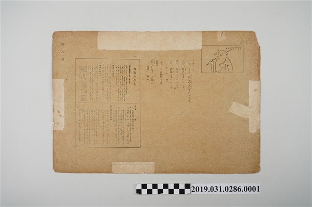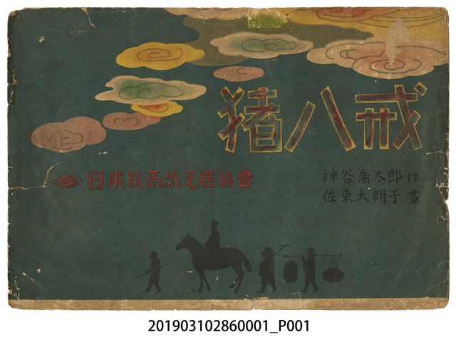 1.本物件為日本教育畫劇株式會社《豬八戒》紙芝居(按:連環圖紙話劇)。為紙製材質,除了封面,主要故事有5張。封面底色為淡藍色,背景是唐三藏師徒到西方取經的剪影。上方寫著「豬八戒」,右邊寫著「神谷喬太郎作 佐東大朗子畫」,左邊寫著「日本教育畫劇株式會社」。第1張是編號一,手拿武器的豬八戒正在講話,背面附有日文說明和表演方法。第2張是編號二,豬八戒、孫悟空及沙悟淨三人正在講話,背面附有日文說明。第3張是編號十,豬八戒正在想像著美女和美食,背面附有日文說明。第4張是編號十一,豬八戒手拿酒杯,正在接受兩位美女的款待,背面附有日文說明。第5張是編號十九,在夕陽的餘暉下,繼續朝著天竺邁進的唐三藏師徒一行人,背面附有日文說明,作品解說及出版項。