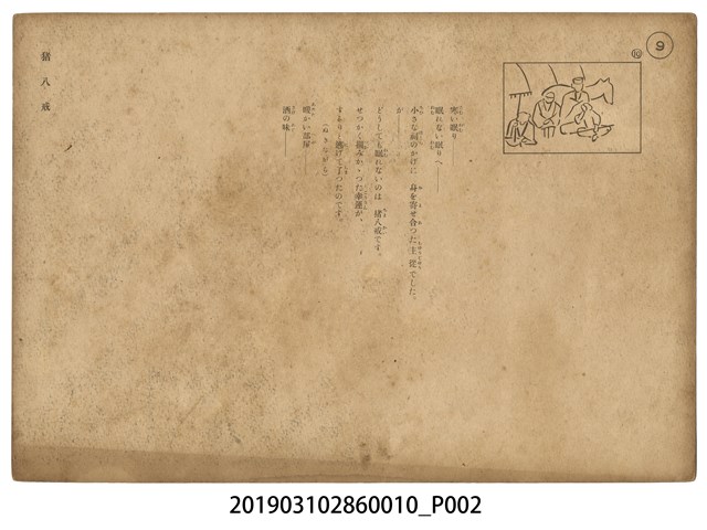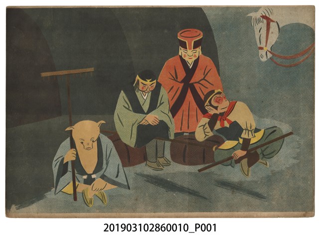 1.本物件為日本教育畫劇株式會社《豬八戒》紙芝居(按:連環圖紙話劇)。為紙製材質,除了封面,主要故事有5張。封面底色為淡藍色,背景是唐三藏師徒到西方取經的剪影。上方寫著「豬八戒」,右邊寫著「神谷喬太郎作 佐東大朗子畫」,左邊寫著「日本教育畫劇株式會社」。第1張是編號一,手拿武器的豬八戒正在講話,背面附有日文說明和表演方法。第2張是編號二,豬八戒、孫悟空及沙悟淨三人正在講話,背面附有日文說明。第3張是編號十,豬八戒正在想像著美女和美食,背面附有日文說明。第4張是編號十一,豬八戒手拿酒杯,正在接受兩位美女的款待,背面附有日文說明。第5張是編號十九,在夕陽的餘暉下,繼續朝著天竺邁進的唐三藏師徒一行人,背面附有日文說明,作品解說及出版項。