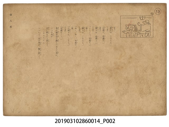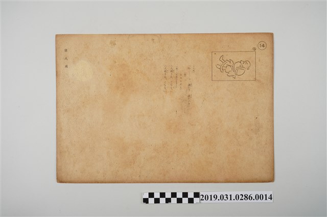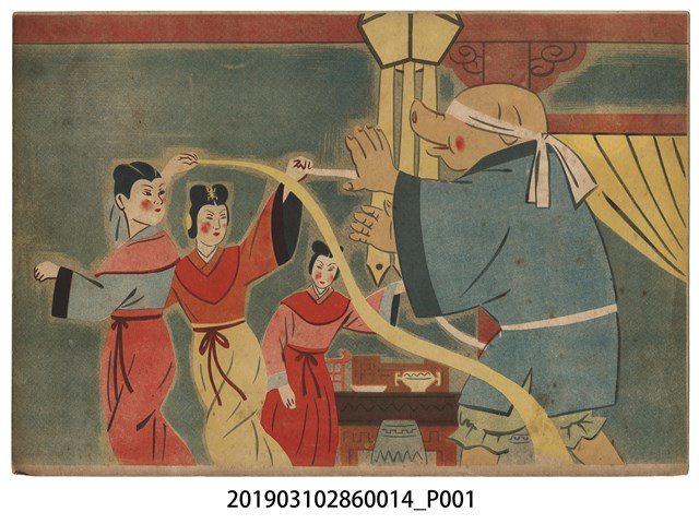 1.本物件為日本教育畫劇株式會社《豬八戒》紙芝居(按:連環圖紙話劇)。為紙製材質,除了封面,主要故事有5張。封面底色為淡藍色,背景是唐三藏師徒到西方取經的剪影。上方寫著「豬八戒」,右邊寫著「神谷喬太郎作 佐東大朗子畫」,左邊寫著「日本教育畫劇株式會社」。第1張是編號一,手拿武器的豬八戒正在講話,背面附有日文說明和表演方法。第2張是編號二,豬八戒、孫悟空及沙悟淨三人正在講話,背面附有日文說明。第3張是編號十,豬八戒正在想像著美女和美食,背面附有日文說明。第4張是編號十一,豬八戒手拿酒杯,正在接受兩位美女的款待,背面附有日文說明。第5張是編號十九,在夕陽的餘暉下,繼續朝著天竺邁進的唐三藏師徒一行人,背面附有日文說明,作品解說及出版項。