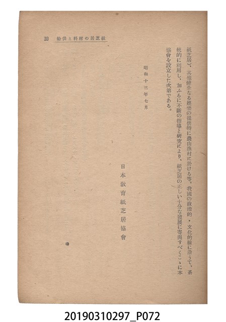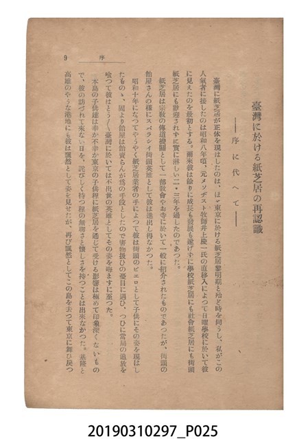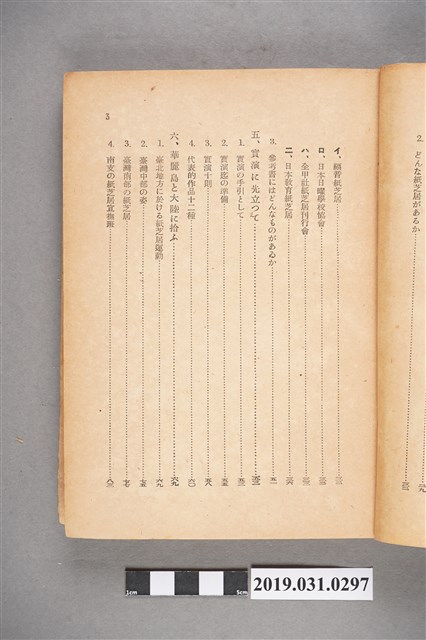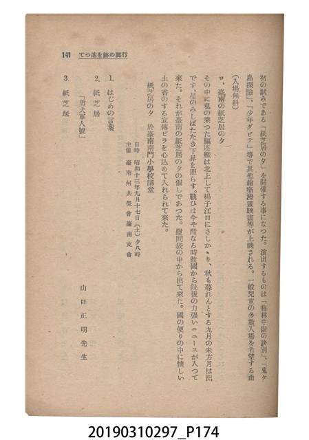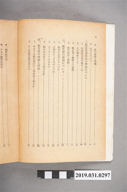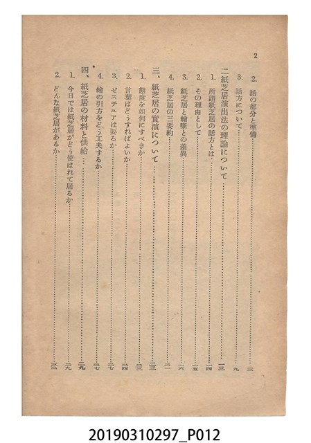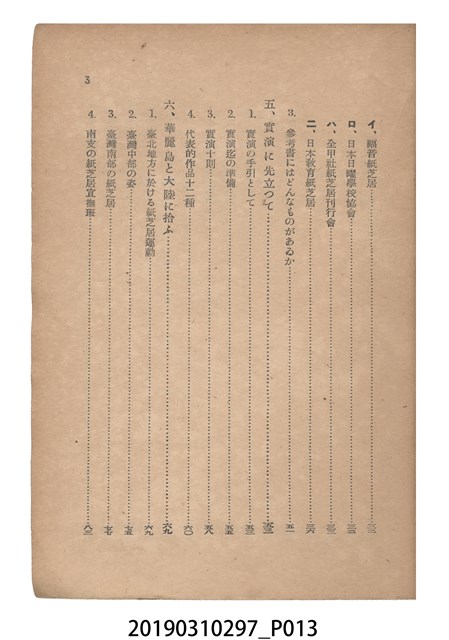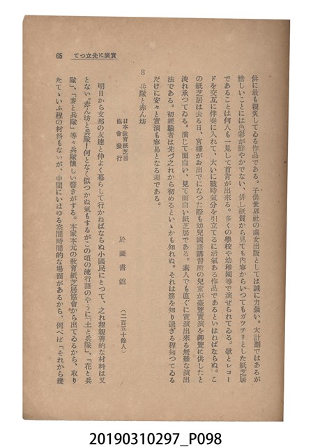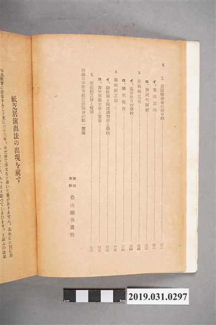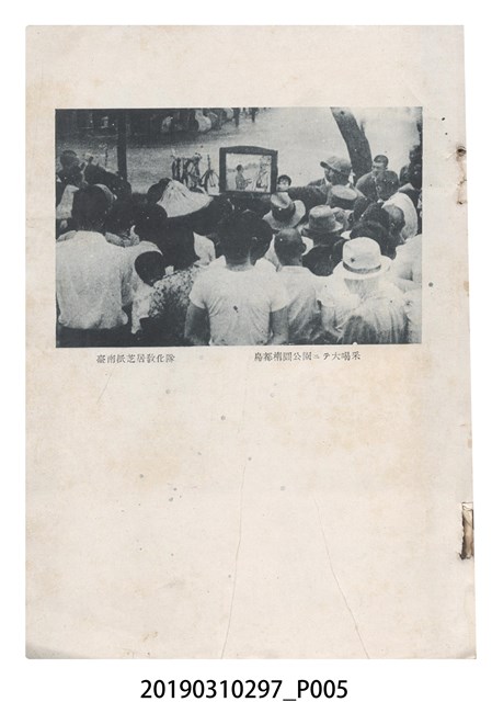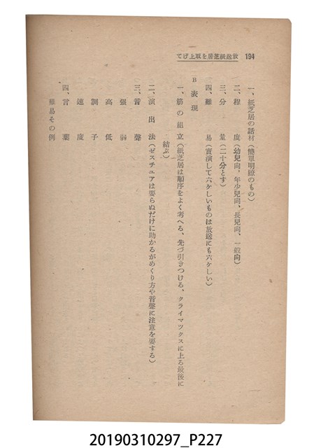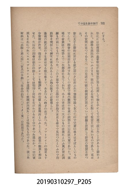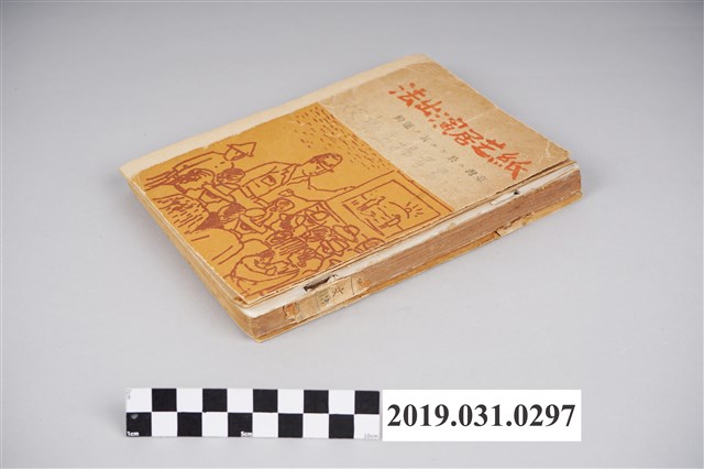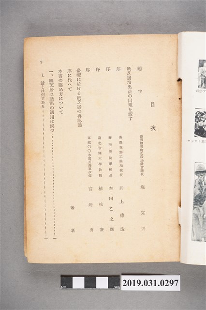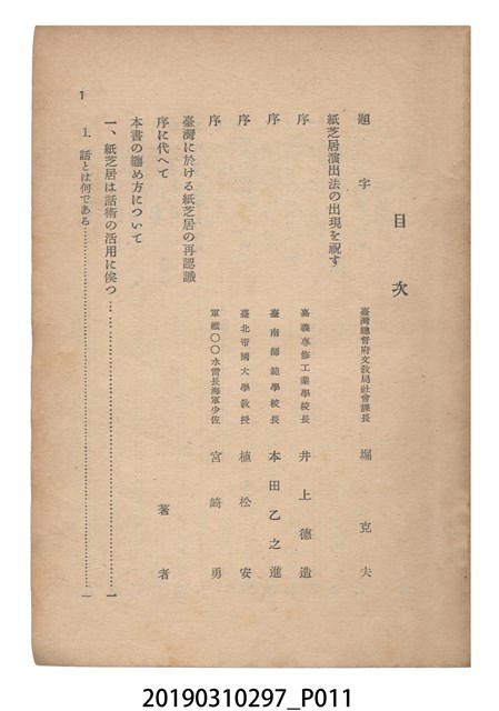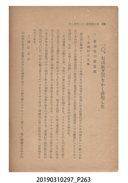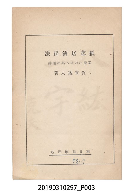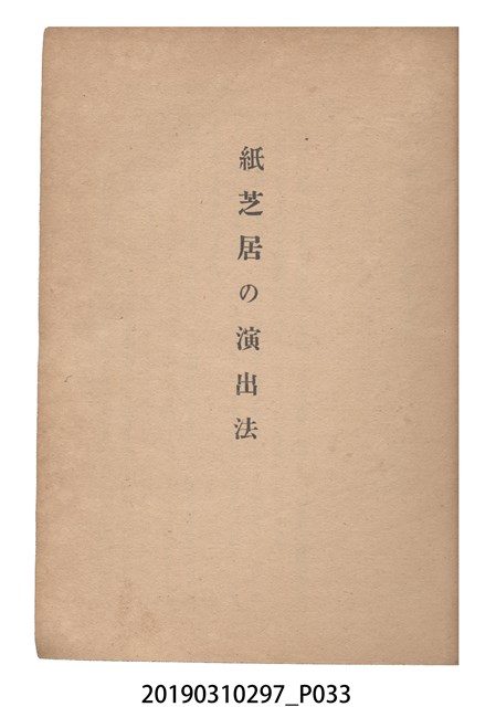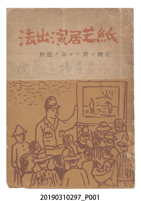 1.本物件為臺南紙芝居研究會發行的《紙芝居演出法》,紙芝居是日文連環圖話劇之意。書本為平裝。封面、封底以上白、下橙為底色,封面上半部以紅字由右而左橫寫「紙芝居演出法」書名,書名下方有黑字「臺灣ニ於ケル其ノ運動」副標題(按:其在臺灣的運動);下半部繪製紙芝居演出圖畫。封底繪製母親帶孩童往廟口觀劇的圖畫。正文前放入數張紙芝居演出情況及相關人士照片;照片頁後為目次;目次後為嘉義專修工業學校長井上德造、臺南師範學校長本田乙之進、臺北帝國大學教授植松安等數人所撰寫的序文及代序。內容包括紙芝居說話技巧之活用、關於紙芝居演出法之理論、有關紙芝居之實演、紙芝居之前置工作、在華麗島和大陸之進行、遵循行腳之跡、放送紙芝居操作、皇紀二千六百年奉祝紙芝居大會、我的活用紙芝居方式等10個部分。正文後附錄日本教育紙芝居協會活動一覽圖。最末頁是版權頁,上載著作、發行、印刷及定價資訊。 2.日本在1920年代,街頭賣糖果零食的商人以紙芝居演出作為招攬生意的方法,大受兒童歡迎,因此紙芝居團在日本快速興起,至1930年代為黃金時代,這股風氣也影響至臺灣。日本教育學者一方面擔憂紙芝居的譁眾取向會對兒童有壞的影響,一方面又看好其啟迪民眾的效用,因而推動紙芝居教材之製作及應用於教學。紙芝居最初運用於幼稚園及低年級教學,內容以童話故事為主。1941年,皇民奉公會附屬團體臺灣紙芝居協會成立,各地亦紛紛設立紙芝居研究會,紙芝居成為皇民化時期宣傳國策的利器,舉凡戰爭動員、鼓勵增產、儲蓄報國等,均一一成為紙芝居演出的主題。