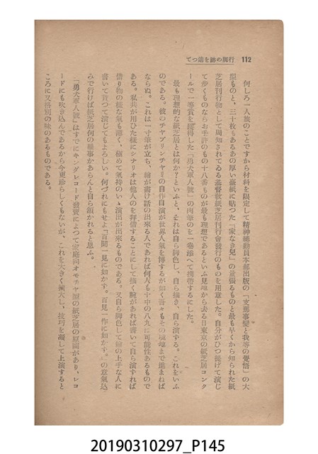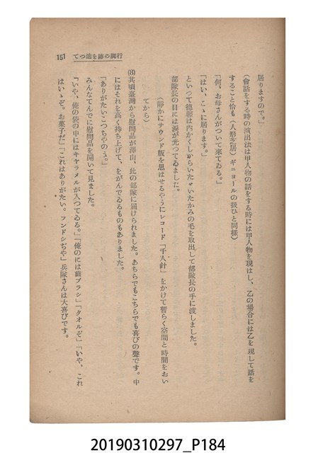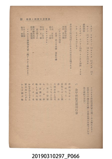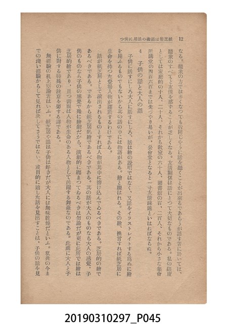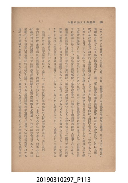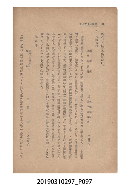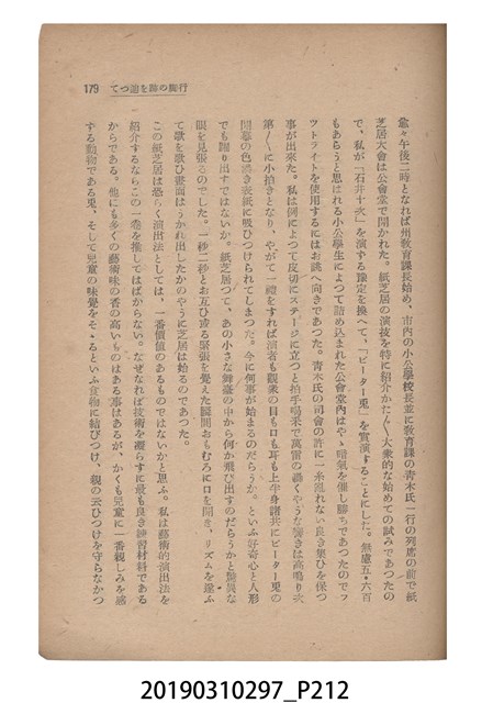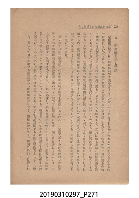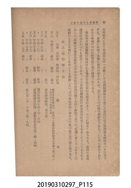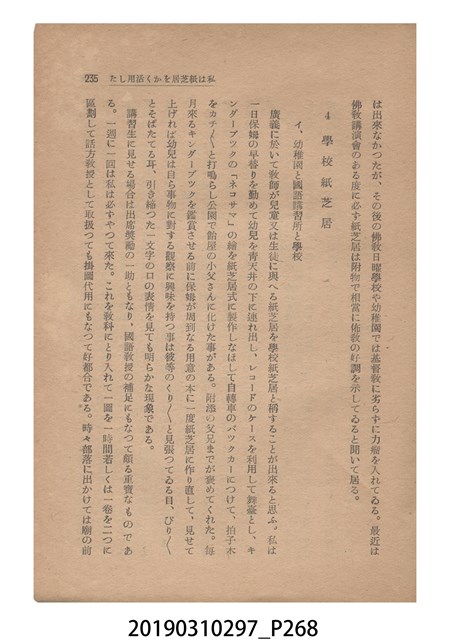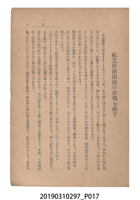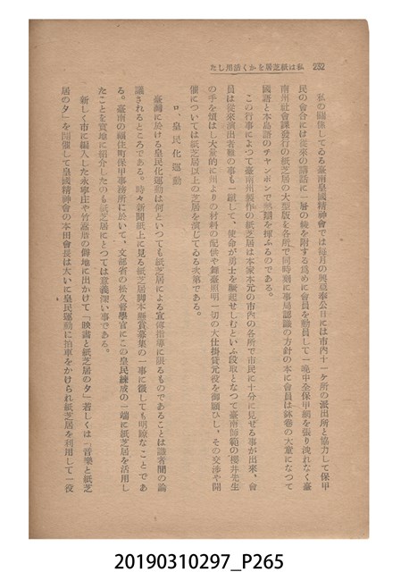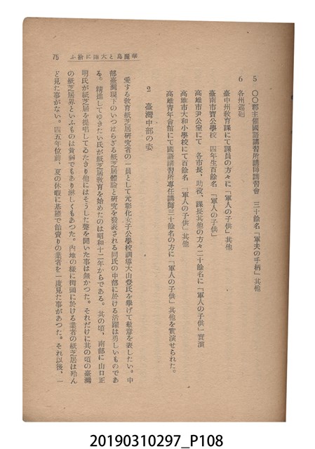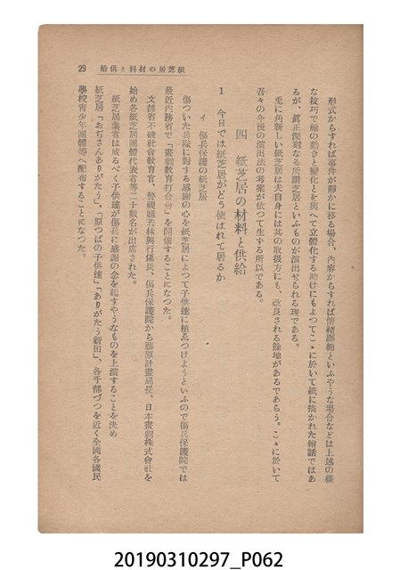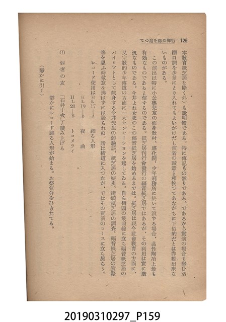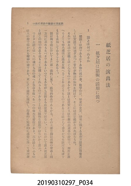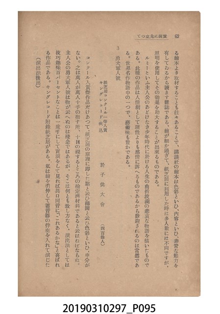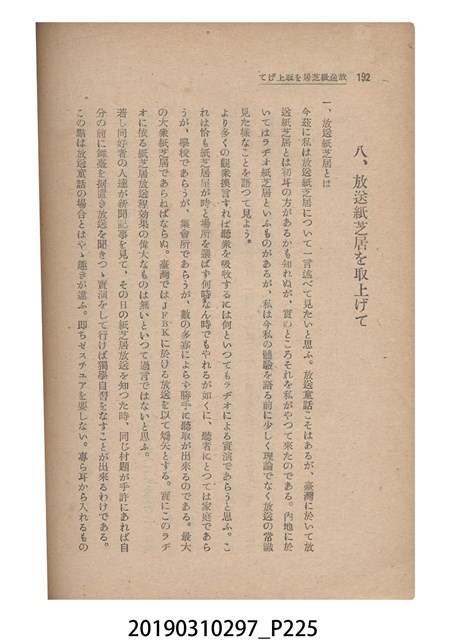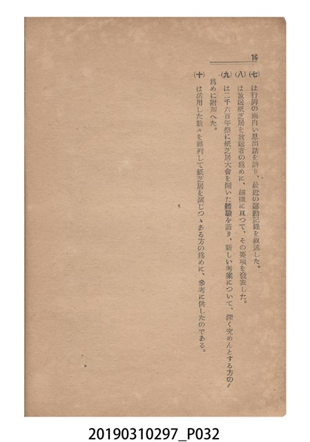 1.本物件為臺南紙芝居研究會發行的《紙芝居演出法》,紙芝居是日文連環圖話劇之意。書本為平裝。封面、封底以上白、下橙為底色,封面上半部以紅字由右而左橫寫「紙芝居演出法」書名,書名下方有黑字「臺灣ニ於ケル其ノ運動」副標題(按:其在臺灣的運動);下半部繪製紙芝居演出圖畫。封底繪製母親帶孩童往廟口觀劇的圖畫。正文前放入數張紙芝居演出情況及相關人士照片;照片頁後為目次;目次後為嘉義專修工業學校長井上德造、臺南師範學校長本田乙之進、臺北帝國大學教授植松安等數人所撰寫的序文及代序。內容包括紙芝居說話技巧之活用、關於紙芝居演出法之理論、有關紙芝居之實演、紙芝居之前置工作、在華麗島和大陸之進行、遵循行腳之跡、放送紙芝居操作、皇紀二千六百年奉祝紙芝居大會、我的活用紙芝居方式等10個部分。正文後附錄日本教育紙芝居協會活動一覽圖。最末頁是版權頁,上載著作、發行、印刷及定價資訊。 2.日本在1920年代,街頭賣糖果零食的商人以紙芝居演出作為招攬生意的方法,大受兒童歡迎,因此紙芝居團在日本快速興起,至1930年代為黃金時代,這股風氣也影響至臺灣。日本教育學者一方面擔憂紙芝居的譁眾取向會對兒童有壞的影響,一方面又看好其啟迪民眾的效用,因而推動紙芝居教材之製作及應用於教學。紙芝居最初運用於幼稚園及低年級教學,內容以童話故事為主。1941年,皇民奉公會附屬團體臺灣紙芝居協會成立,各地亦紛紛設立紙芝居研究會,紙芝居成為皇民化時期宣傳國策的利器,舉凡戰爭動員、鼓勵增產、儲蓄報國等,均一一成為紙芝居演出的主題。