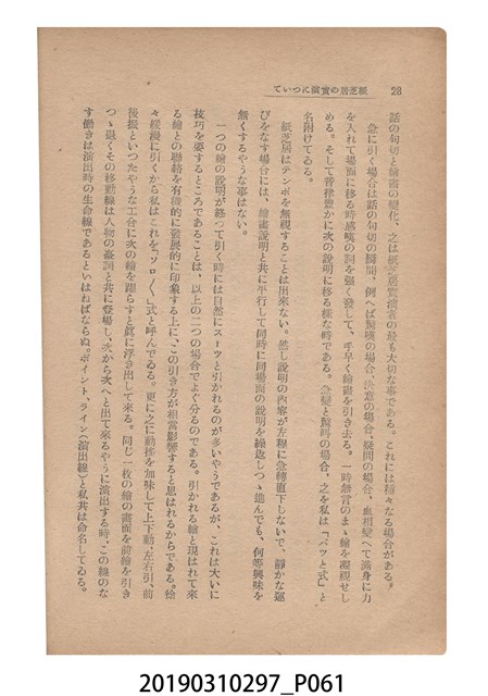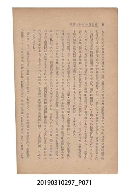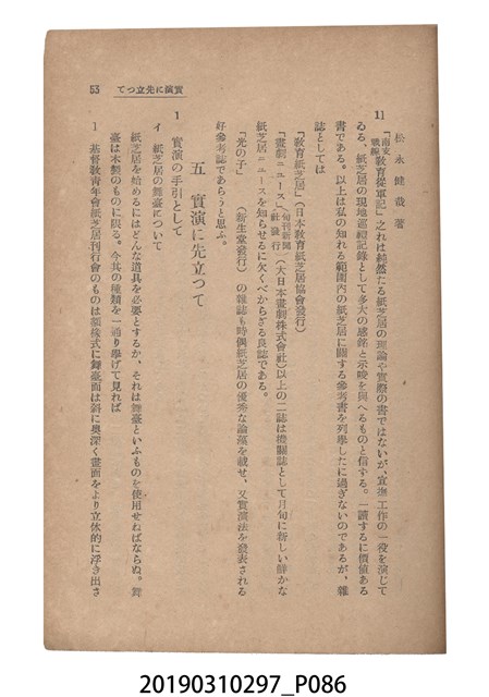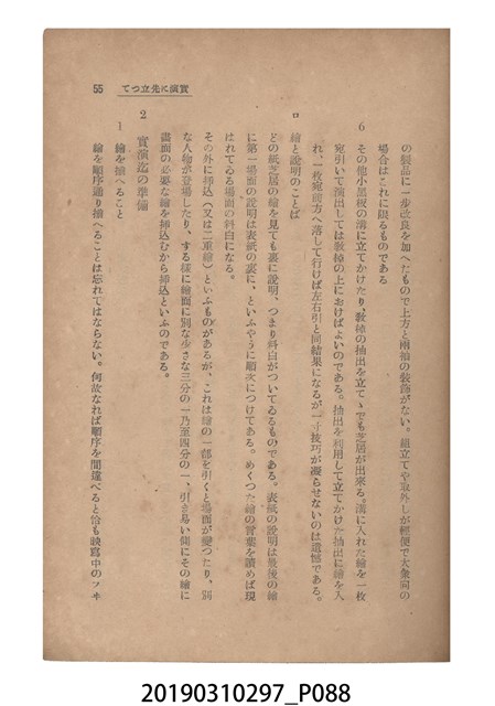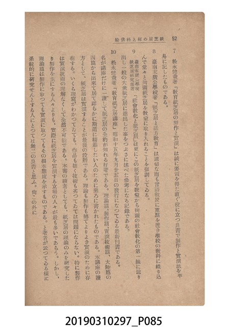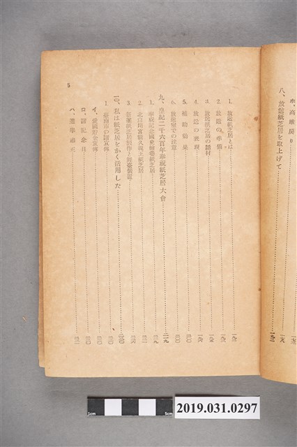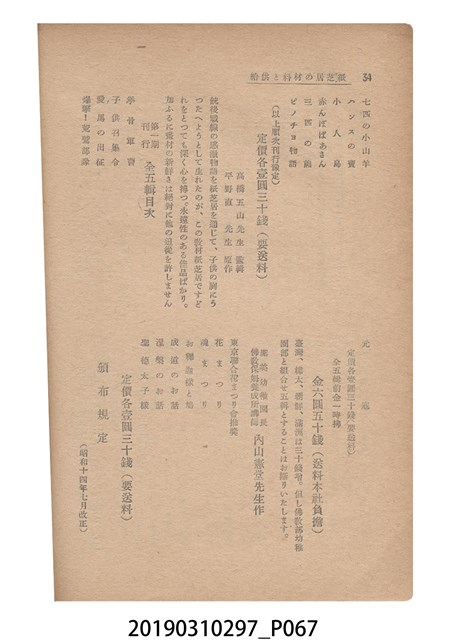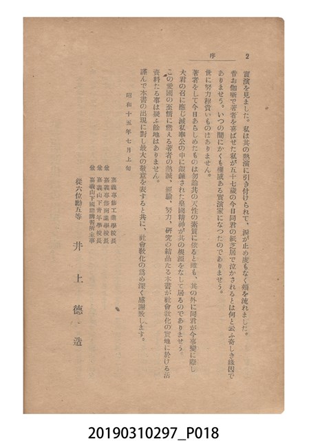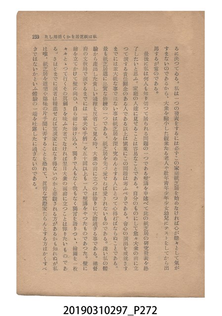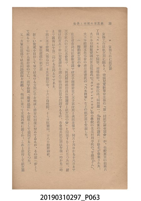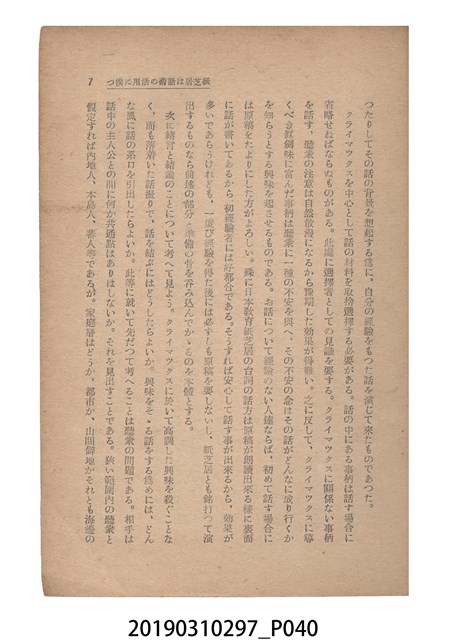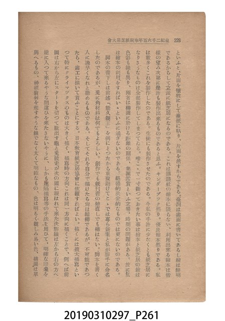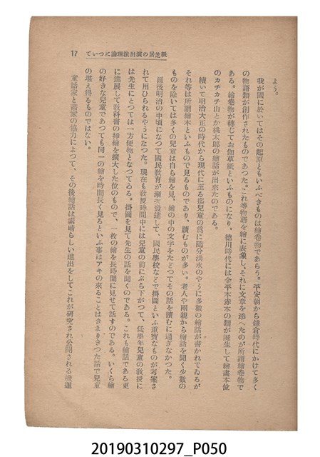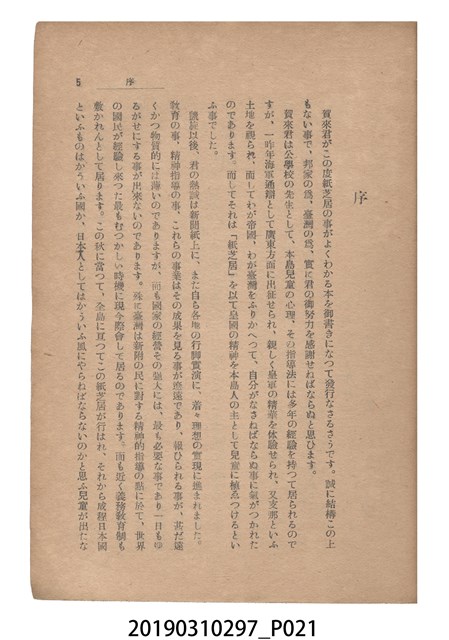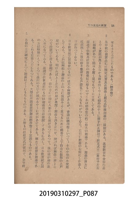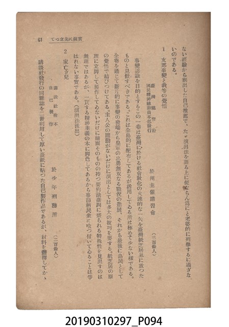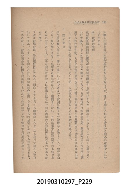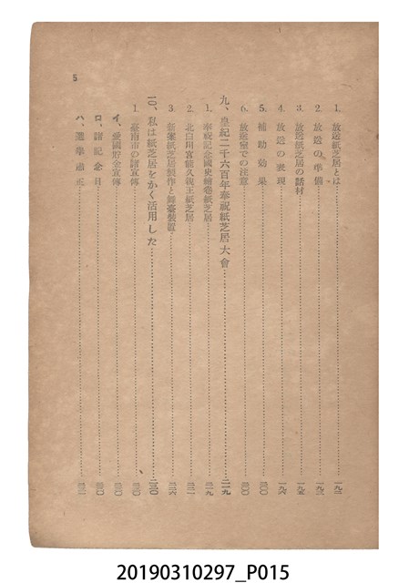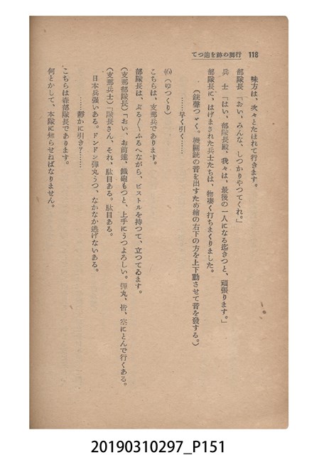 1.本物件為臺南紙芝居研究會發行的《紙芝居演出法》,紙芝居是日文連環圖話劇之意。書本為平裝。封面、封底以上白、下橙為底色,封面上半部以紅字由右而左橫寫「紙芝居演出法」書名,書名下方有黑字「臺灣ニ於ケル其ノ運動」副標題(按:其在臺灣的運動);下半部繪製紙芝居演出圖畫。封底繪製母親帶孩童往廟口觀劇的圖畫。正文前放入數張紙芝居演出情況及相關人士照片;照片頁後為目次;目次後為嘉義專修工業學校長井上德造、臺南師範學校長本田乙之進、臺北帝國大學教授植松安等數人所撰寫的序文及代序。內容包括紙芝居說話技巧之活用、關於紙芝居演出法之理論、有關紙芝居之實演、紙芝居之前置工作、在華麗島和大陸之進行、遵循行腳之跡、放送紙芝居操作、皇紀二千六百年奉祝紙芝居大會、我的活用紙芝居方式等10個部分。正文後附錄日本教育紙芝居協會活動一覽圖。最末頁是版權頁,上載著作、發行、印刷及定價資訊。 2.日本在1920年代,街頭賣糖果零食的商人以紙芝居演出作為招攬生意的方法,大受兒童歡迎,因此紙芝居團在日本快速興起,至1930年代為黃金時代,這股風氣也影響至臺灣。日本教育學者一方面擔憂紙芝居的譁眾取向會對兒童有壞的影響,一方面又看好其啟迪民眾的效用,因而推動紙芝居教材之製作及應用於教學。紙芝居最初運用於幼稚園及低年級教學,內容以童話故事為主。1941年,皇民奉公會附屬團體臺灣紙芝居協會成立,各地亦紛紛設立紙芝居研究會,紙芝居成為皇民化時期宣傳國策的利器,舉凡戰爭動員、鼓勵增產、儲蓄報國等,均一一成為紙芝居演出的主題。