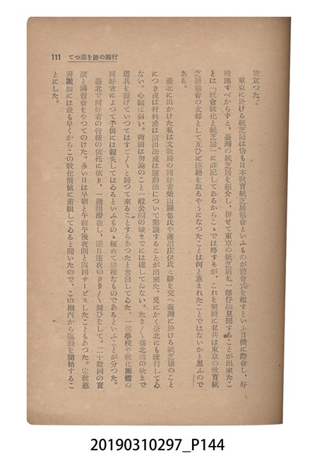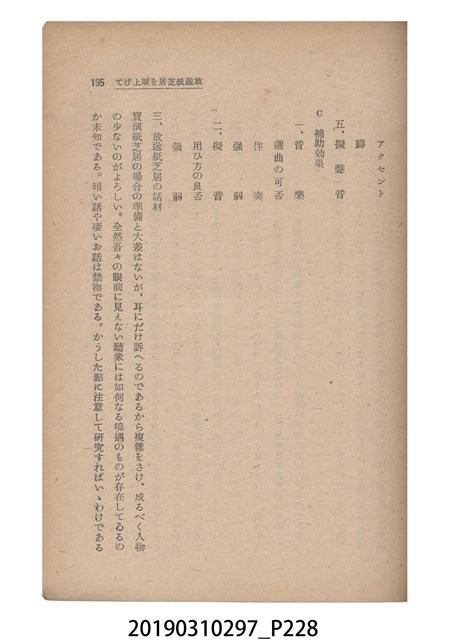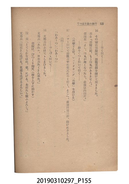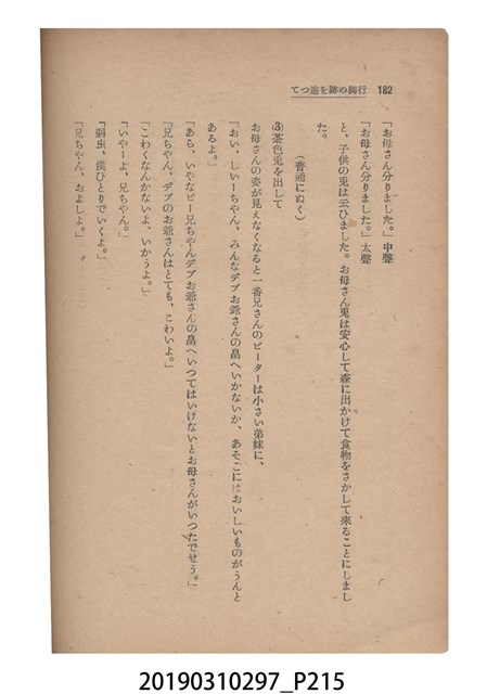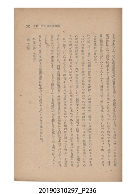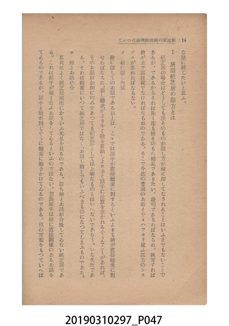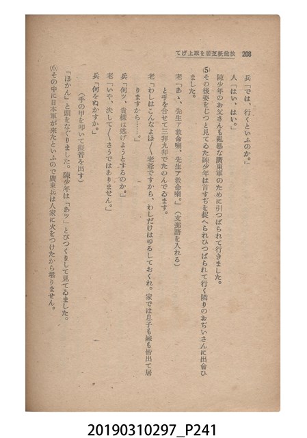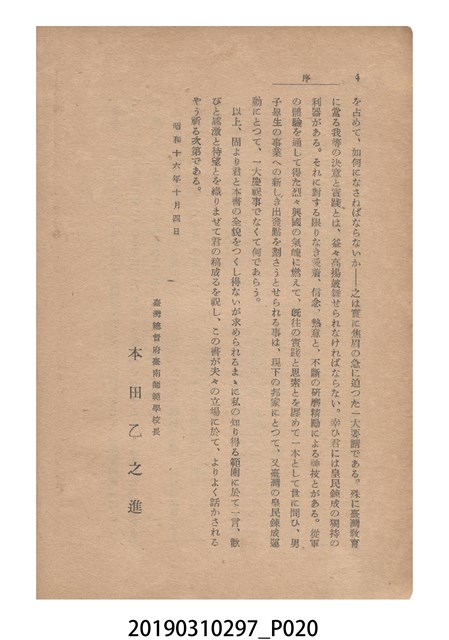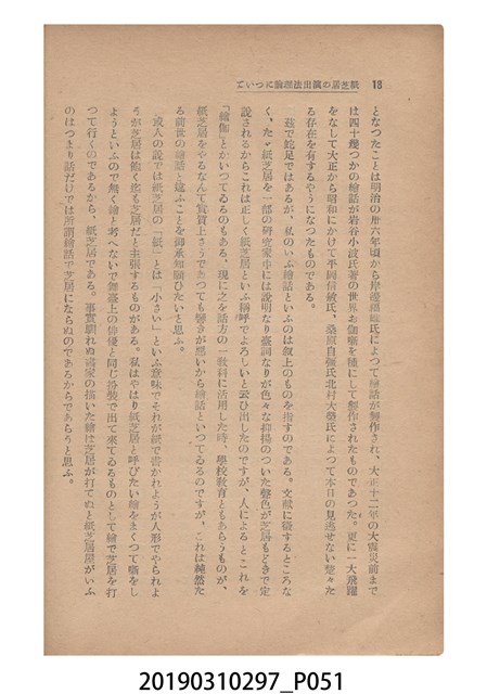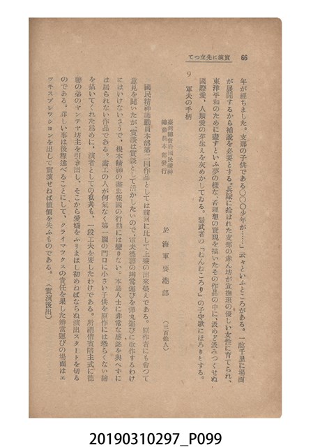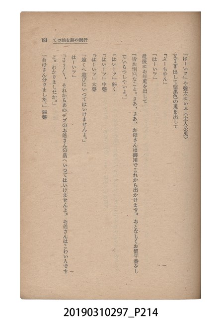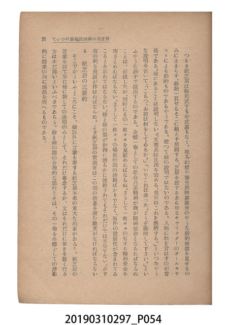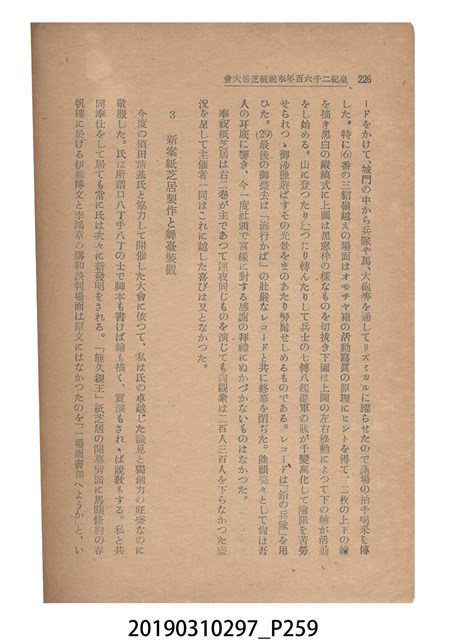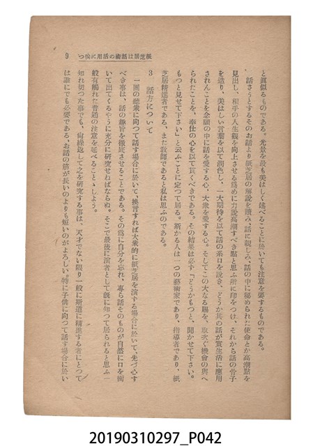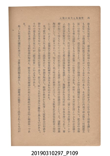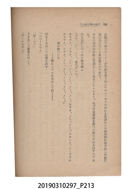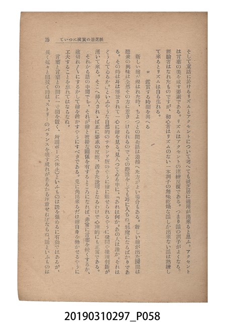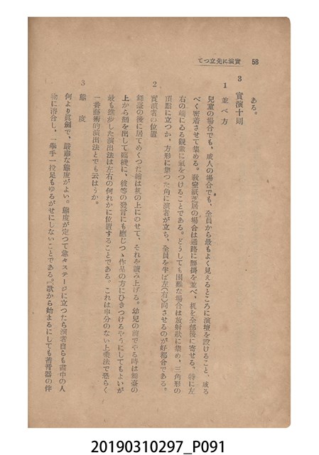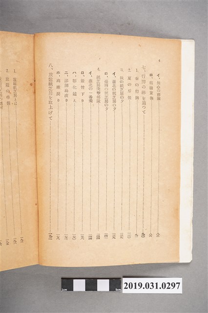 1.本物件為臺南紙芝居研究會發行的《紙芝居演出法》,紙芝居是日文連環圖話劇之意。書本為平裝。封面、封底以上白、下橙為底色,封面上半部以紅字由右而左橫寫「紙芝居演出法」書名,書名下方有黑字「臺灣ニ於ケル其ノ運動」副標題(按:其在臺灣的運動);下半部繪製紙芝居演出圖畫。封底繪製母親帶孩童往廟口觀劇的圖畫。正文前放入數張紙芝居演出情況及相關人士照片;照片頁後為目次;目次後為嘉義專修工業學校長井上德造、臺南師範學校長本田乙之進、臺北帝國大學教授植松安等數人所撰寫的序文及代序。內容包括紙芝居說話技巧之活用、關於紙芝居演出法之理論、有關紙芝居之實演、紙芝居之前置工作、在華麗島和大陸之進行、遵循行腳之跡、放送紙芝居操作、皇紀二千六百年奉祝紙芝居大會、我的活用紙芝居方式等10個部分。正文後附錄日本教育紙芝居協會活動一覽圖。最末頁是版權頁,上載著作、發行、印刷及定價資訊。 2.日本在1920年代,街頭賣糖果零食的商人以紙芝居演出作為招攬生意的方法,大受兒童歡迎,因此紙芝居團在日本快速興起,至1930年代為黃金時代,這股風氣也影響至臺灣。日本教育學者一方面擔憂紙芝居的譁眾取向會對兒童有壞的影響,一方面又看好其啟迪民眾的效用,因而推動紙芝居教材之製作及應用於教學。紙芝居最初運用於幼稚園及低年級教學,內容以童話故事為主。1941年,皇民奉公會附屬團體臺灣紙芝居協會成立,各地亦紛紛設立紙芝居研究會,紙芝居成為皇民化時期宣傳國策的利器,舉凡戰爭動員、鼓勵增產、儲蓄報國等,均一一成為紙芝居演出的主題。