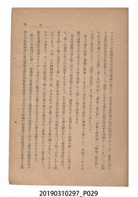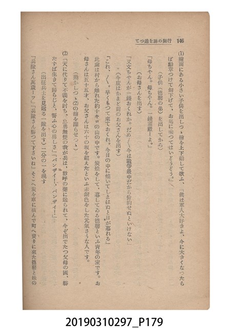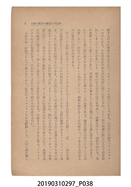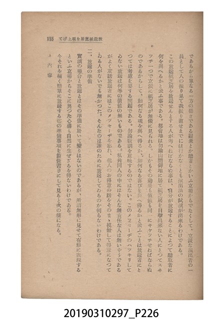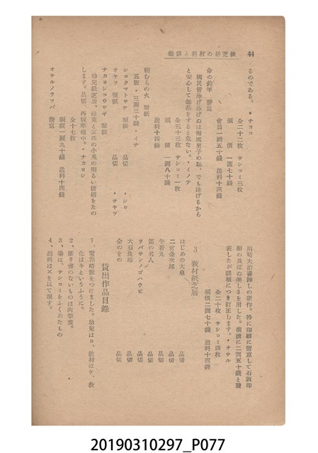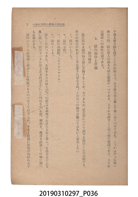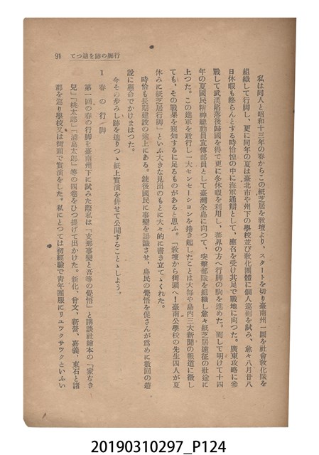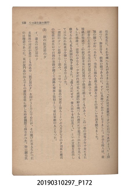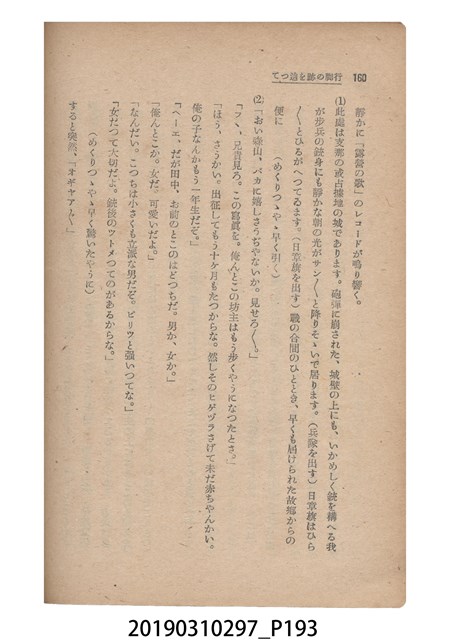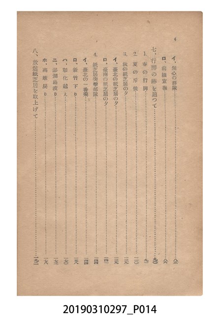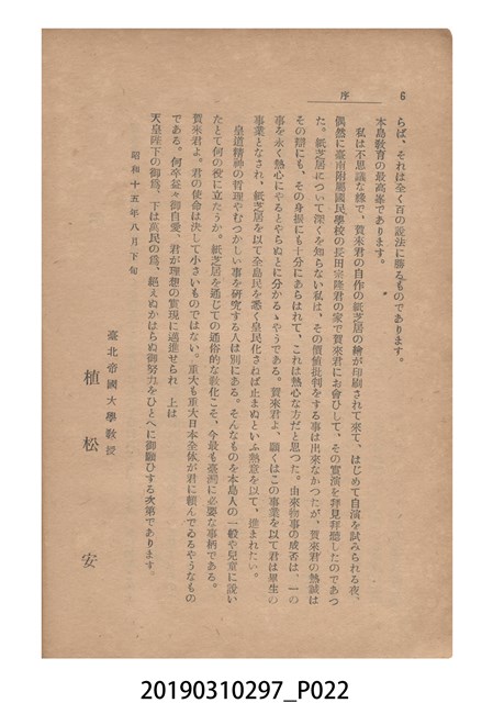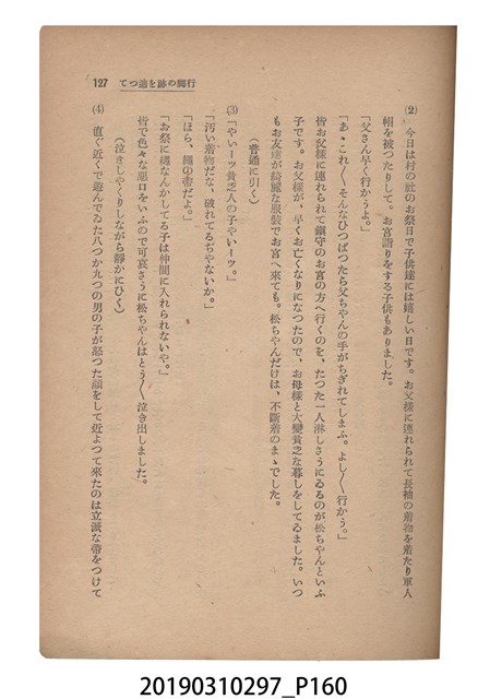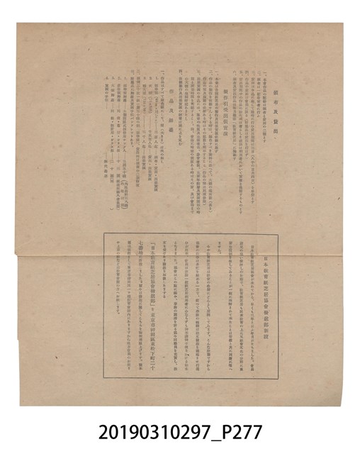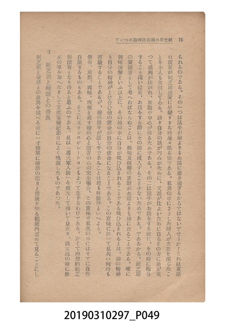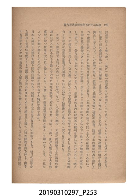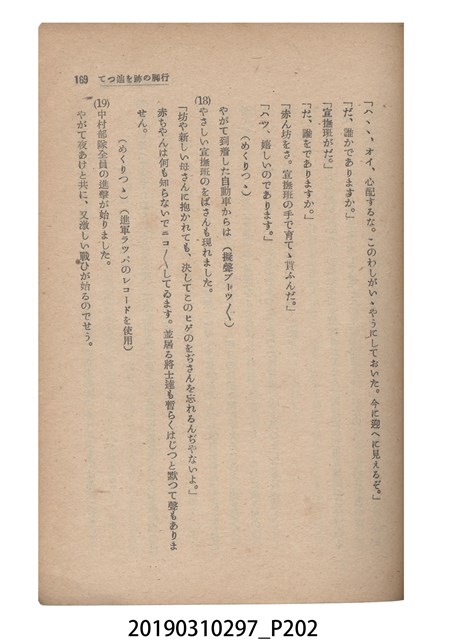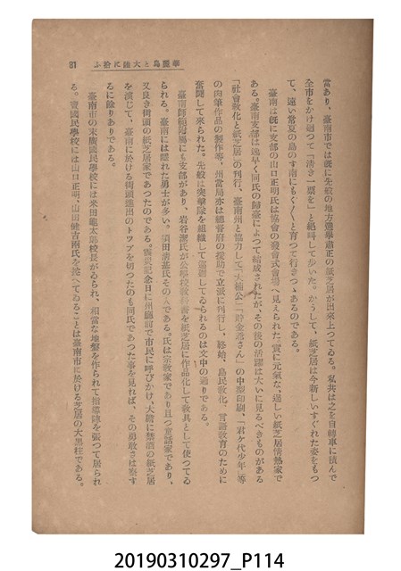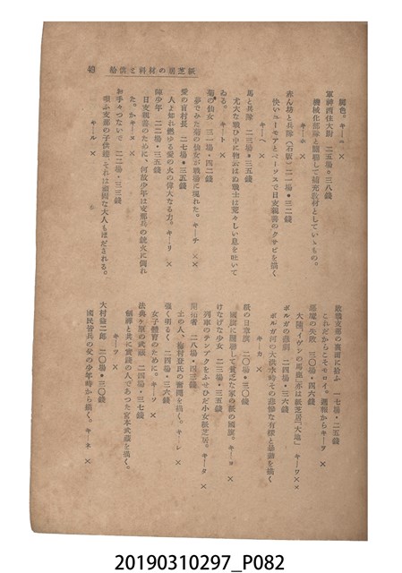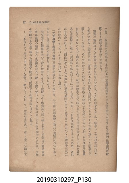 1.本物件為臺南紙芝居研究會發行的《紙芝居演出法》,紙芝居是日文連環圖話劇之意。書本為平裝。封面、封底以上白、下橙為底色,封面上半部以紅字由右而左橫寫「紙芝居演出法」書名,書名下方有黑字「臺灣ニ於ケル其ノ運動」副標題(按:其在臺灣的運動);下半部繪製紙芝居演出圖畫。封底繪製母親帶孩童往廟口觀劇的圖畫。正文前放入數張紙芝居演出情況及相關人士照片;照片頁後為目次;目次後為嘉義專修工業學校長井上德造、臺南師範學校長本田乙之進、臺北帝國大學教授植松安等數人所撰寫的序文及代序。內容包括紙芝居說話技巧之活用、關於紙芝居演出法之理論、有關紙芝居之實演、紙芝居之前置工作、在華麗島和大陸之進行、遵循行腳之跡、放送紙芝居操作、皇紀二千六百年奉祝紙芝居大會、我的活用紙芝居方式等10個部分。正文後附錄日本教育紙芝居協會活動一覽圖。最末頁是版權頁,上載著作、發行、印刷及定價資訊。 2.日本在1920年代,街頭賣糖果零食的商人以紙芝居演出作為招攬生意的方法,大受兒童歡迎,因此紙芝居團在日本快速興起,至1930年代為黃金時代,這股風氣也影響至臺灣。日本教育學者一方面擔憂紙芝居的譁眾取向會對兒童有壞的影響,一方面又看好其啟迪民眾的效用,因而推動紙芝居教材之製作及應用於教學。紙芝居最初運用於幼稚園及低年級教學,內容以童話故事為主。1941年,皇民奉公會附屬團體臺灣紙芝居協會成立,各地亦紛紛設立紙芝居研究會,紙芝居成為皇民化時期宣傳國策的利器,舉凡戰爭動員、鼓勵增產、儲蓄報國等,均一一成為紙芝居演出的主題。
