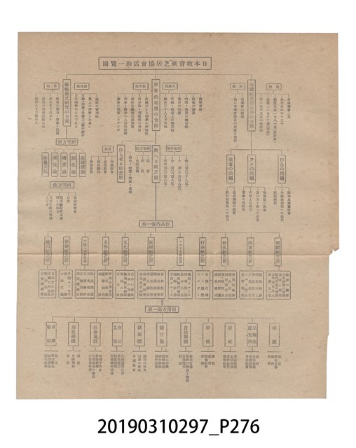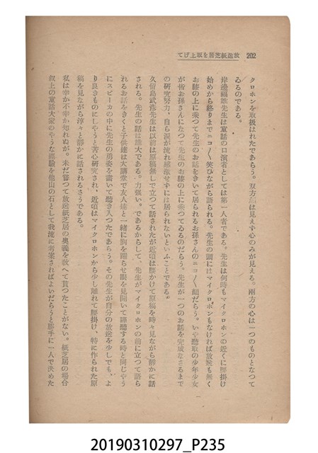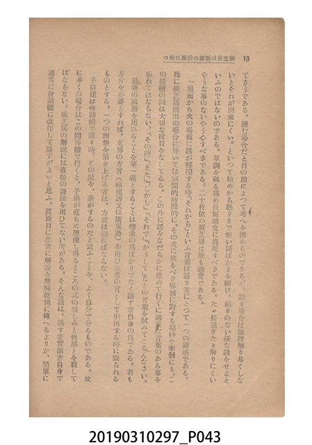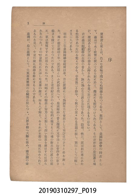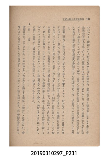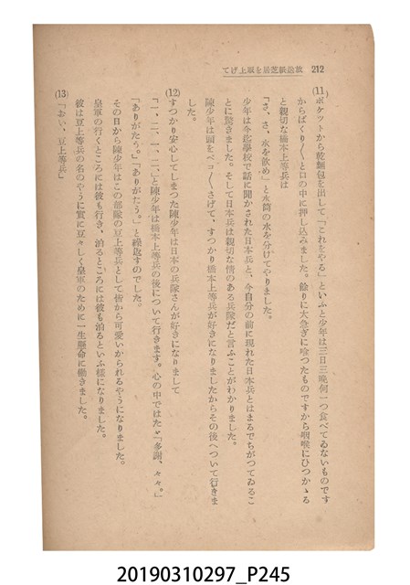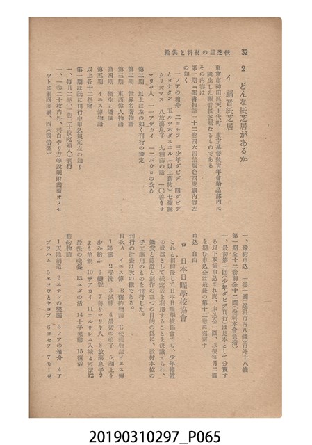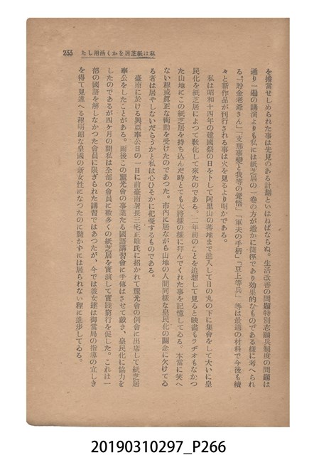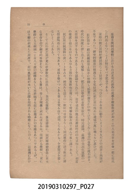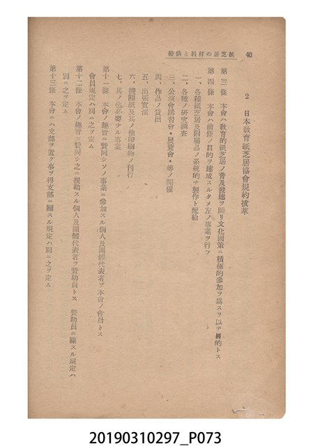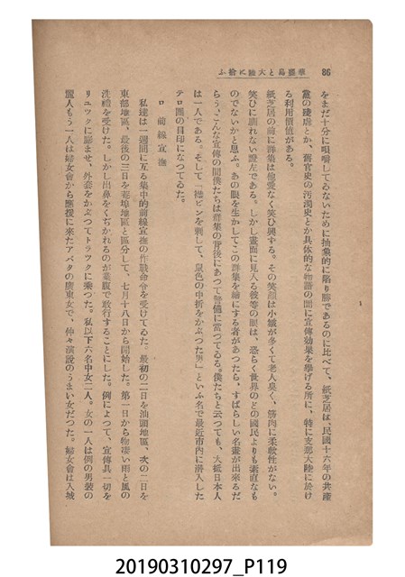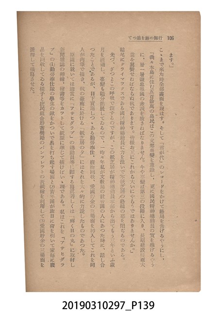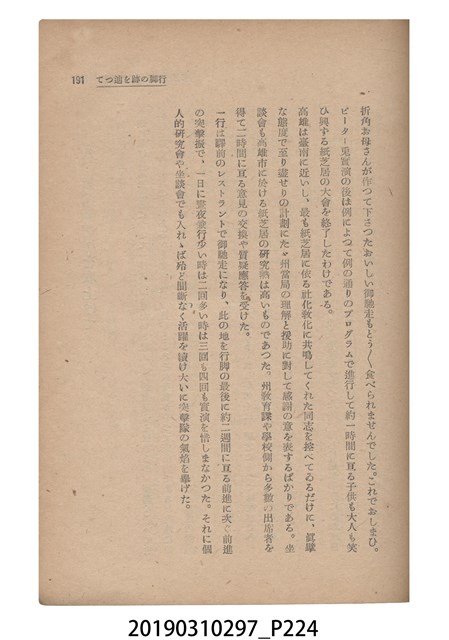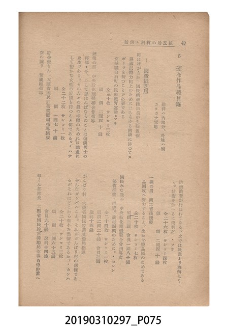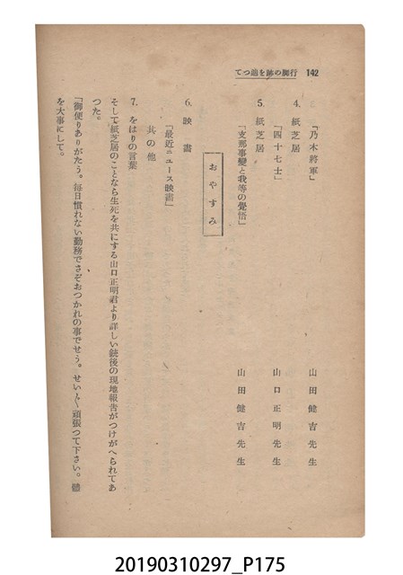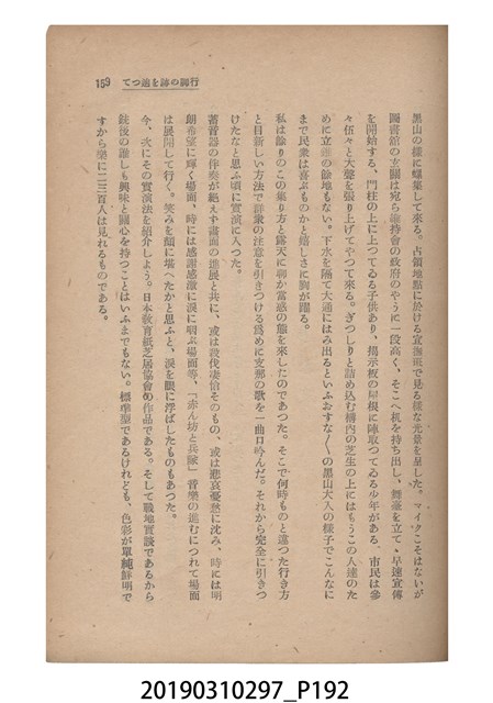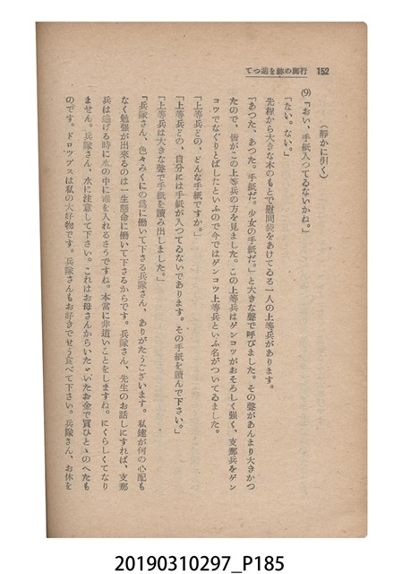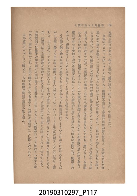 1.本物件為臺南紙芝居研究會發行的《紙芝居演出法》,紙芝居是日文連環圖話劇之意。書本為平裝。封面、封底以上白、下橙為底色,封面上半部以紅字由右而左橫寫「紙芝居演出法」書名,書名下方有黑字「臺灣ニ於ケル其ノ運動」副標題(按:其在臺灣的運動);下半部繪製紙芝居演出圖畫。封底繪製母親帶孩童往廟口觀劇的圖畫。正文前放入數張紙芝居演出情況及相關人士照片;照片頁後為目次;目次後為嘉義專修工業學校長井上德造、臺南師範學校長本田乙之進、臺北帝國大學教授植松安等數人所撰寫的序文及代序。內容包括紙芝居說話技巧之活用、關於紙芝居演出法之理論、有關紙芝居之實演、紙芝居之前置工作、在華麗島和大陸之進行、遵循行腳之跡、放送紙芝居操作、皇紀二千六百年奉祝紙芝居大會、我的活用紙芝居方式等10個部分。正文後附錄日本教育紙芝居協會活動一覽圖。最末頁是版權頁,上載著作、發行、印刷及定價資訊。 2.日本在1920年代,街頭賣糖果零食的商人以紙芝居演出作為招攬生意的方法,大受兒童歡迎,因此紙芝居團在日本快速興起,至1930年代為黃金時代,這股風氣也影響至臺灣。日本教育學者一方面擔憂紙芝居的譁眾取向會對兒童有壞的影響,一方面又看好其啟迪民眾的效用,因而推動紙芝居教材之製作及應用於教學。紙芝居最初運用於幼稚園及低年級教學,內容以童話故事為主。1941年,皇民奉公會附屬團體臺灣紙芝居協會成立,各地亦紛紛設立紙芝居研究會,紙芝居成為皇民化時期宣傳國策的利器,舉凡戰爭動員、鼓勵增產、儲蓄報國等,均一一成為紙芝居演出的主題。