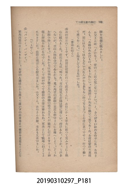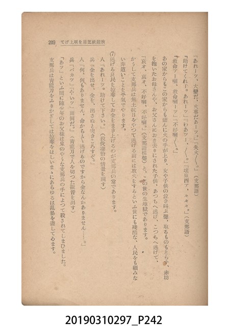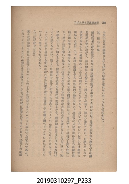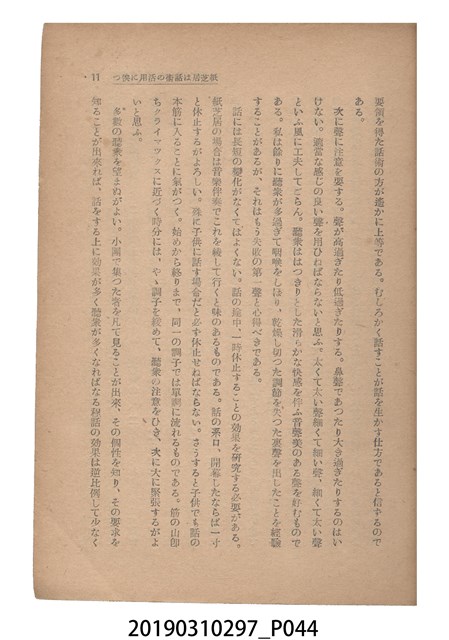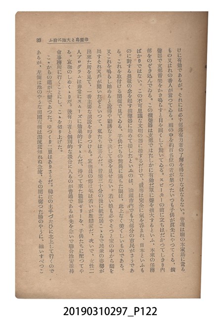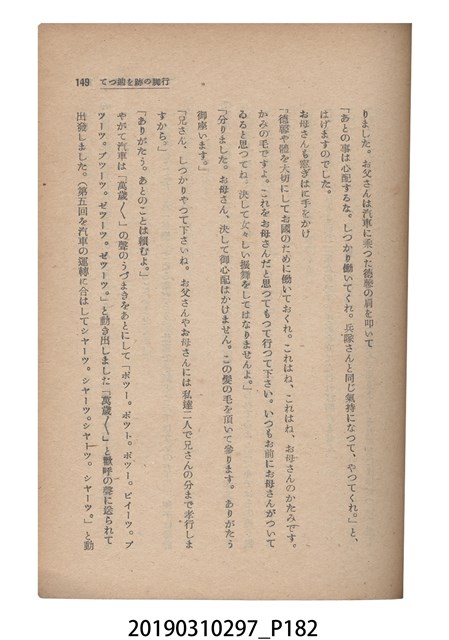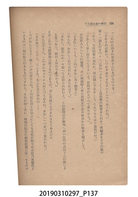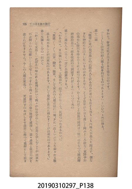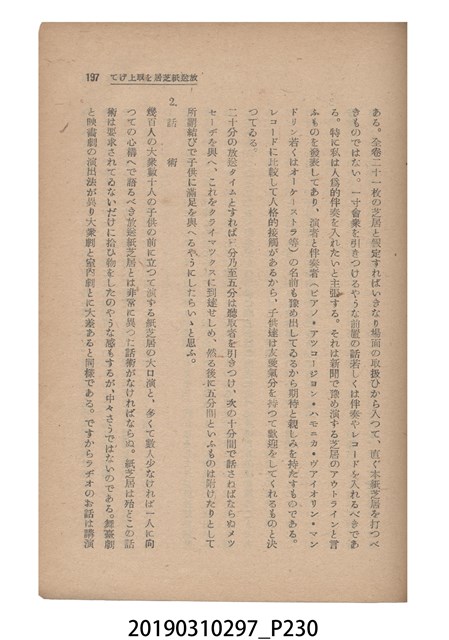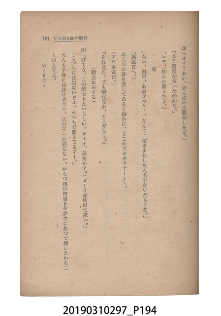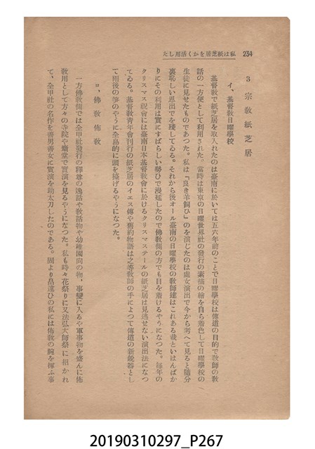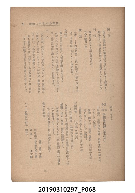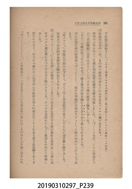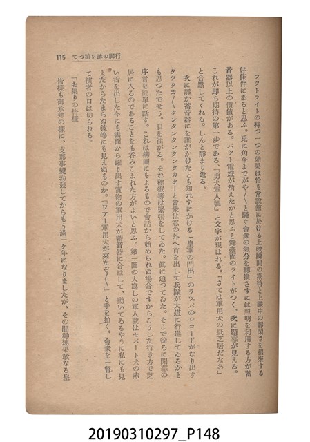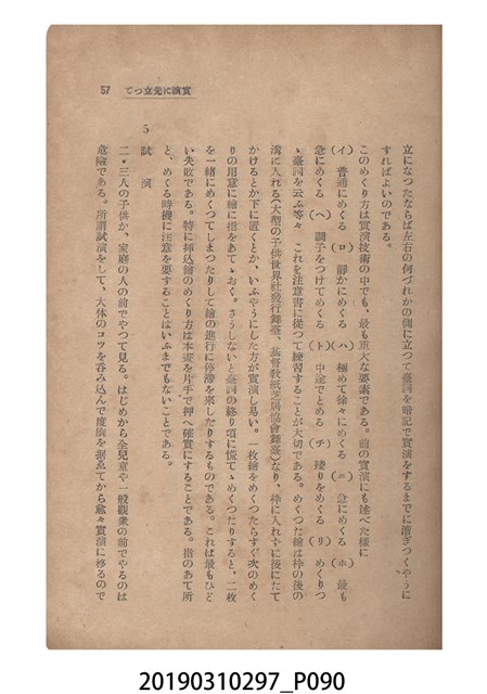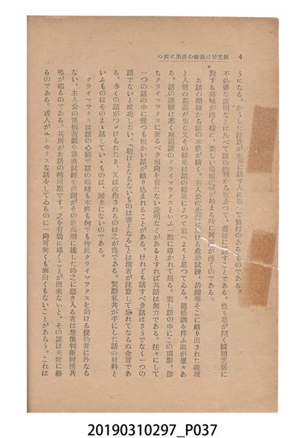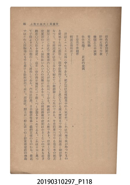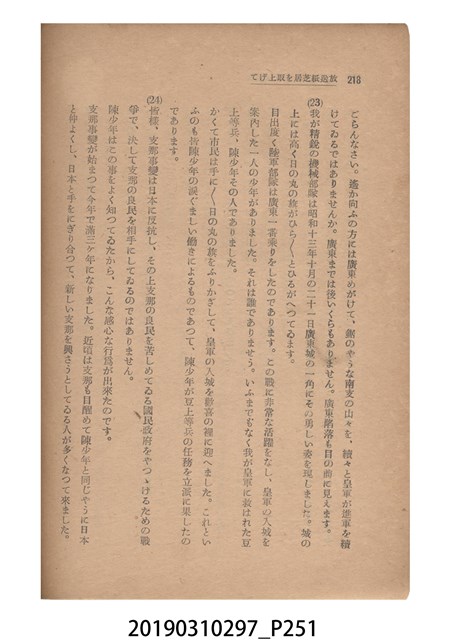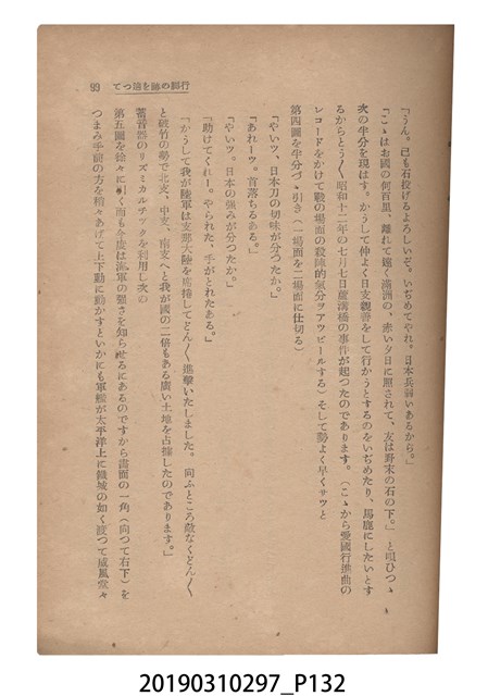 1.本物件為臺南紙芝居研究會發行的《紙芝居演出法》,紙芝居是日文連環圖話劇之意。書本為平裝。封面、封底以上白、下橙為底色,封面上半部以紅字由右而左橫寫「紙芝居演出法」書名,書名下方有黑字「臺灣ニ於ケル其ノ運動」副標題(按:其在臺灣的運動);下半部繪製紙芝居演出圖畫。封底繪製母親帶孩童往廟口觀劇的圖畫。正文前放入數張紙芝居演出情況及相關人士照片;照片頁後為目次;目次後為嘉義專修工業學校長井上德造、臺南師範學校長本田乙之進、臺北帝國大學教授植松安等數人所撰寫的序文及代序。內容包括紙芝居說話技巧之活用、關於紙芝居演出法之理論、有關紙芝居之實演、紙芝居之前置工作、在華麗島和大陸之進行、遵循行腳之跡、放送紙芝居操作、皇紀二千六百年奉祝紙芝居大會、我的活用紙芝居方式等10個部分。正文後附錄日本教育紙芝居協會活動一覽圖。最末頁是版權頁,上載著作、發行、印刷及定價資訊。 2.日本在1920年代,街頭賣糖果零食的商人以紙芝居演出作為招攬生意的方法,大受兒童歡迎,因此紙芝居團在日本快速興起,至1930年代為黃金時代,這股風氣也影響至臺灣。日本教育學者一方面擔憂紙芝居的譁眾取向會對兒童有壞的影響,一方面又看好其啟迪民眾的效用,因而推動紙芝居教材之製作及應用於教學。紙芝居最初運用於幼稚園及低年級教學,內容以童話故事為主。1941年,皇民奉公會附屬團體臺灣紙芝居協會成立,各地亦紛紛設立紙芝居研究會,紙芝居成為皇民化時期宣傳國策的利器,舉凡戰爭動員、鼓勵增產、儲蓄報國等,均一一成為紙芝居演出的主題。