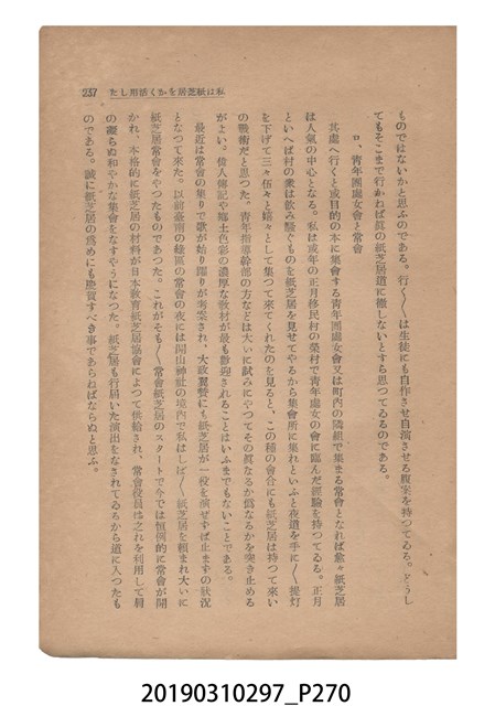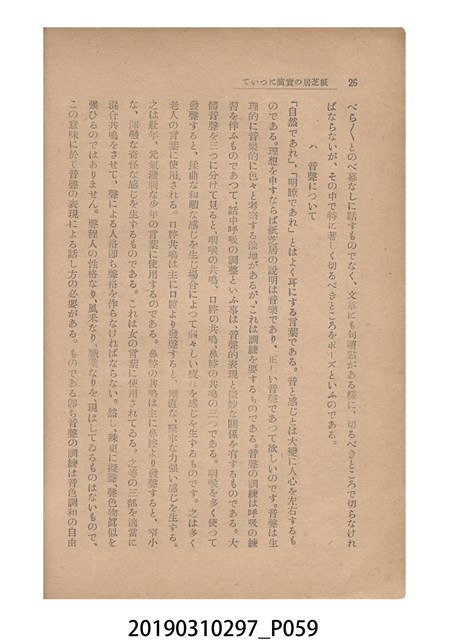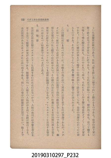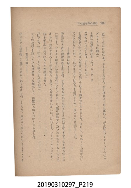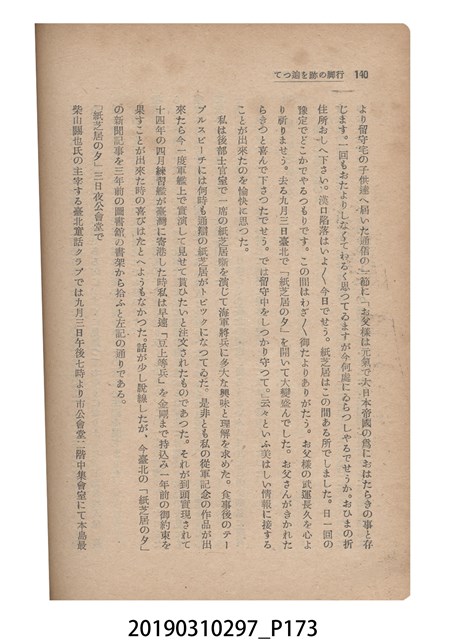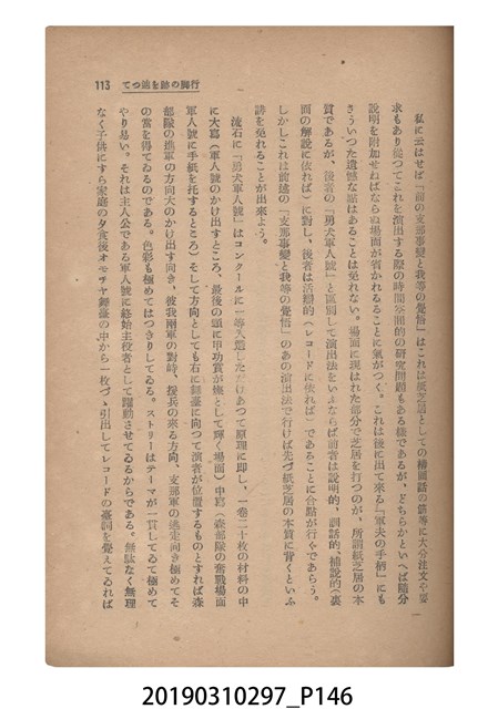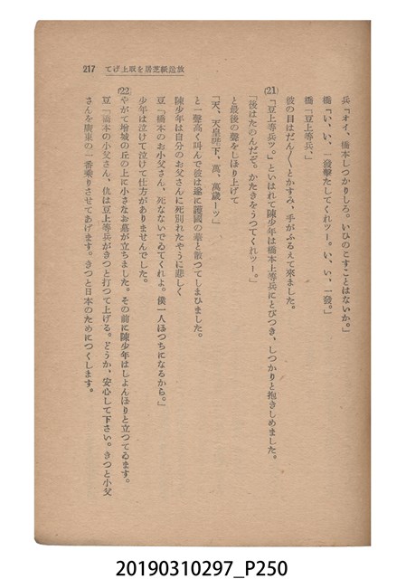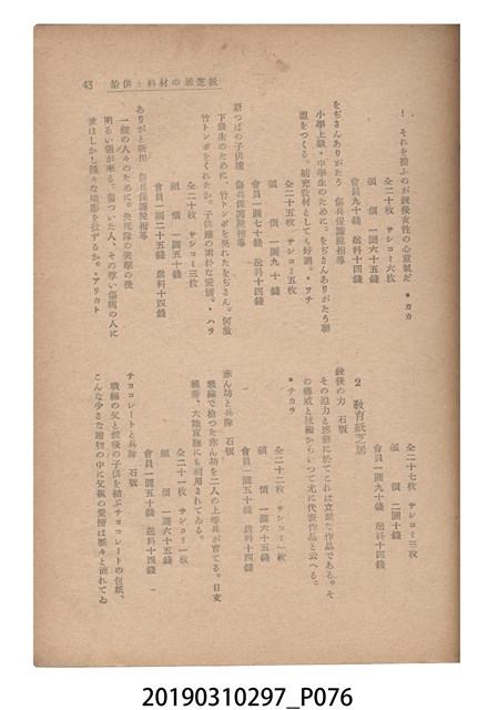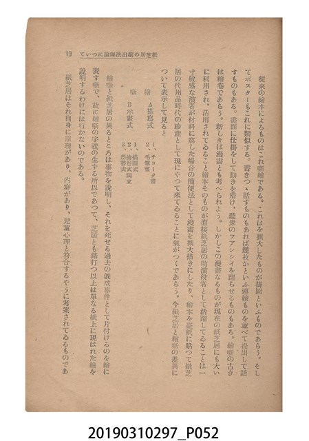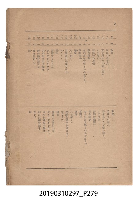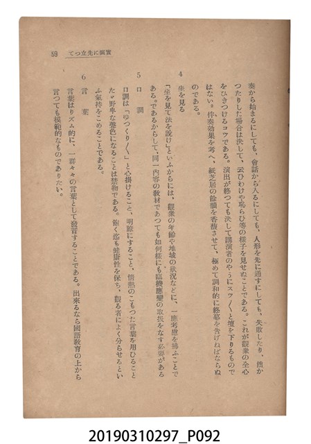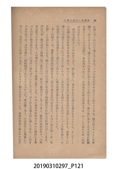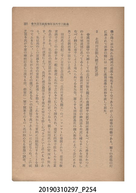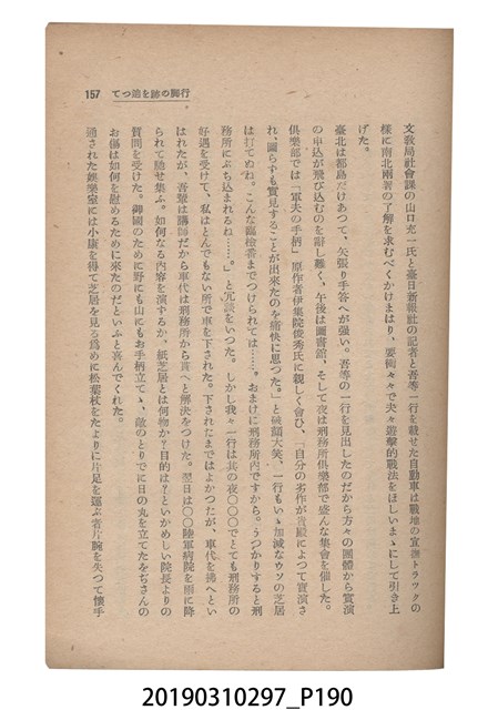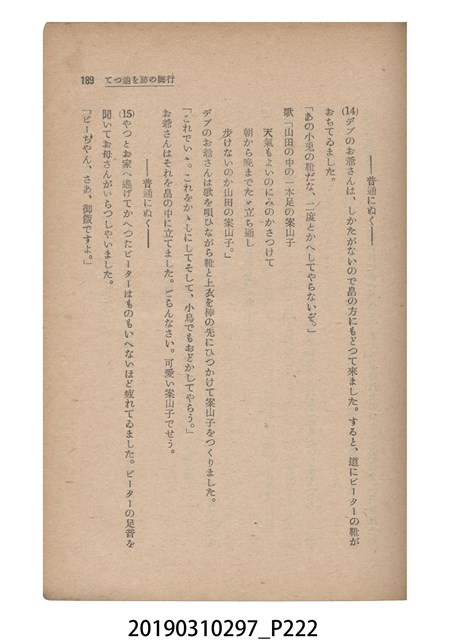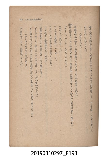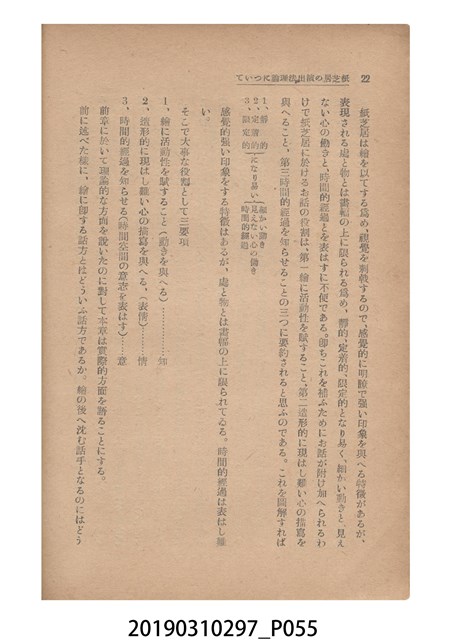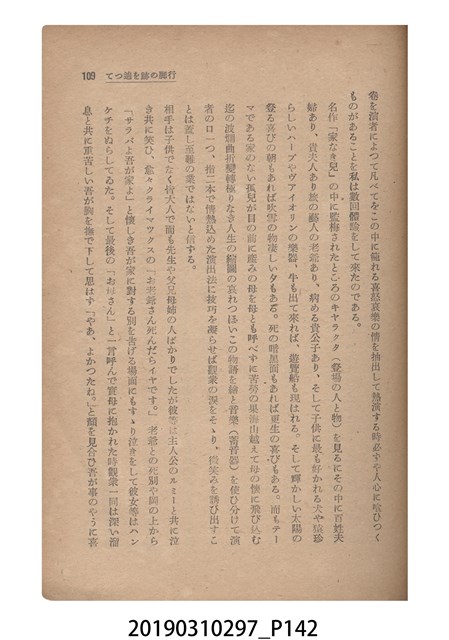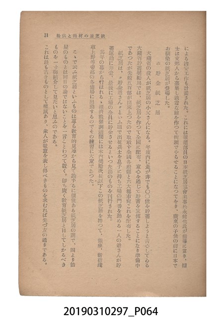 1.本物件為臺南紙芝居研究會發行的《紙芝居演出法》,紙芝居是日文連環圖話劇之意。書本為平裝。封面、封底以上白、下橙為底色,封面上半部以紅字由右而左橫寫「紙芝居演出法」書名,書名下方有黑字「臺灣ニ於ケル其ノ運動」副標題(按:其在臺灣的運動);下半部繪製紙芝居演出圖畫。封底繪製母親帶孩童往廟口觀劇的圖畫。正文前放入數張紙芝居演出情況及相關人士照片;照片頁後為目次;目次後為嘉義專修工業學校長井上德造、臺南師範學校長本田乙之進、臺北帝國大學教授植松安等數人所撰寫的序文及代序。內容包括紙芝居說話技巧之活用、關於紙芝居演出法之理論、有關紙芝居之實演、紙芝居之前置工作、在華麗島和大陸之進行、遵循行腳之跡、放送紙芝居操作、皇紀二千六百年奉祝紙芝居大會、我的活用紙芝居方式等10個部分。正文後附錄日本教育紙芝居協會活動一覽圖。最末頁是版權頁,上載著作、發行、印刷及定價資訊。 2.日本在1920年代,街頭賣糖果零食的商人以紙芝居演出作為招攬生意的方法,大受兒童歡迎,因此紙芝居團在日本快速興起,至1930年代為黃金時代,這股風氣也影響至臺灣。日本教育學者一方面擔憂紙芝居的譁眾取向會對兒童有壞的影響,一方面又看好其啟迪民眾的效用,因而推動紙芝居教材之製作及應用於教學。紙芝居最初運用於幼稚園及低年級教學,內容以童話故事為主。1941年,皇民奉公會附屬團體臺灣紙芝居協會成立,各地亦紛紛設立紙芝居研究會,紙芝居成為皇民化時期宣傳國策的利器,舉凡戰爭動員、鼓勵增產、儲蓄報國等,均一一成為紙芝居演出的主題。