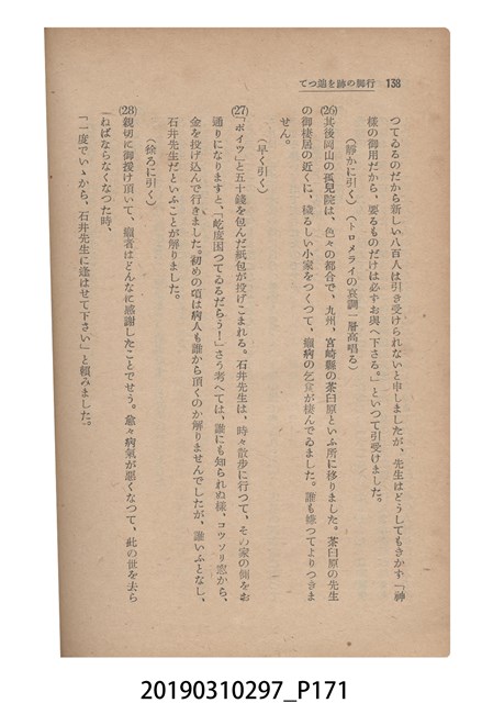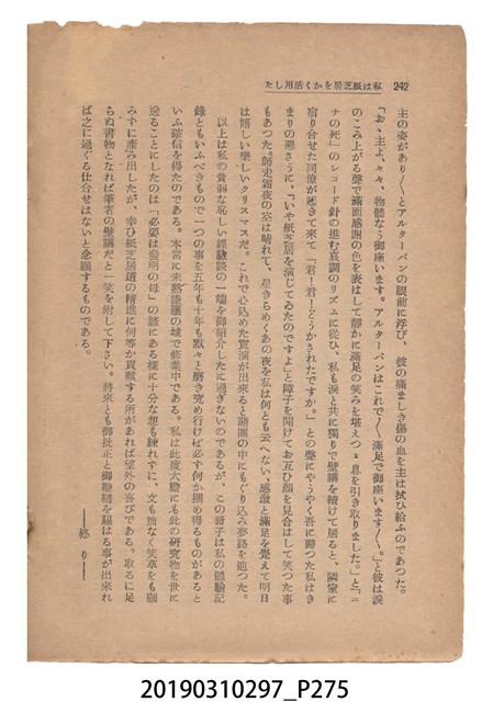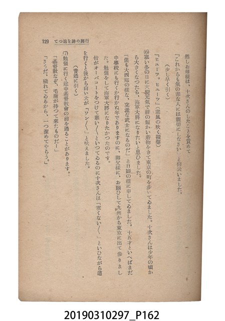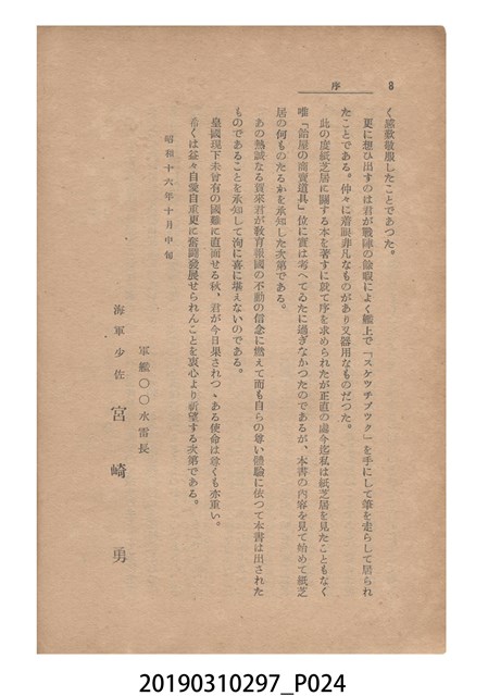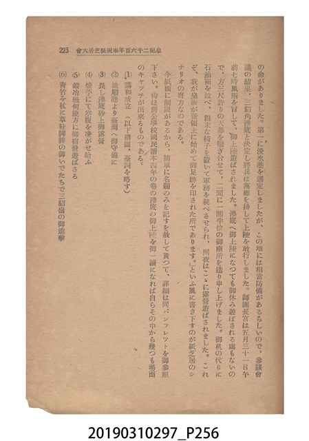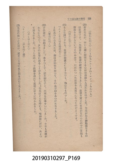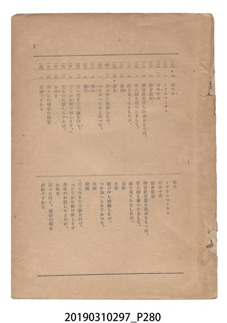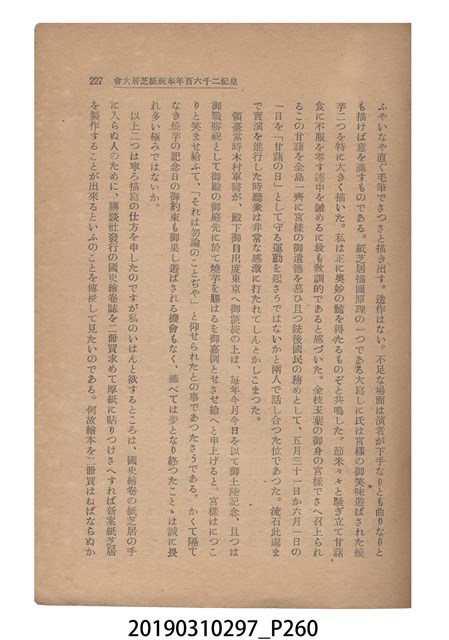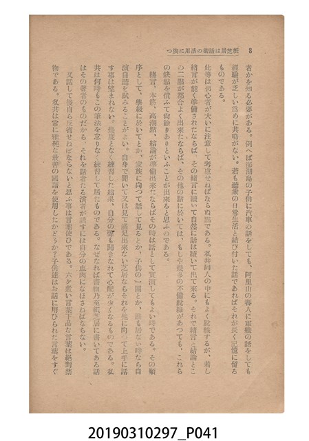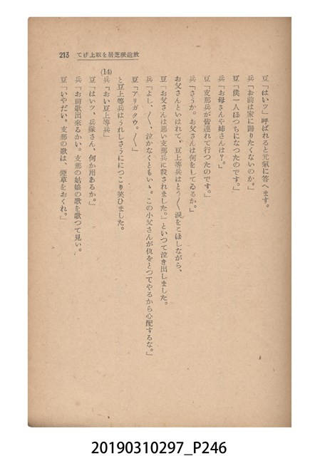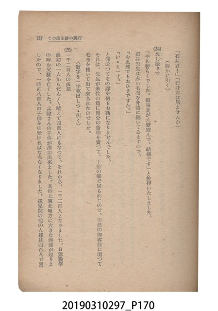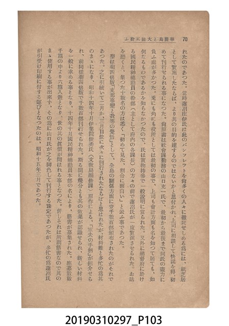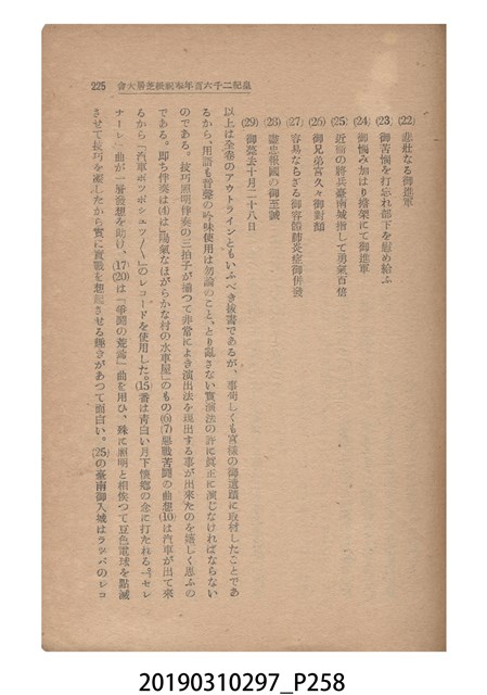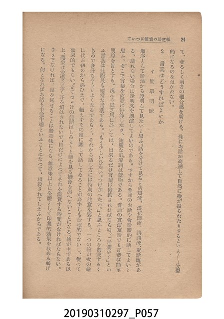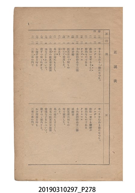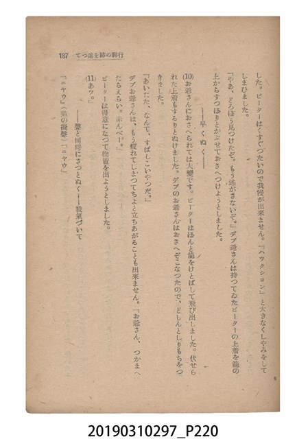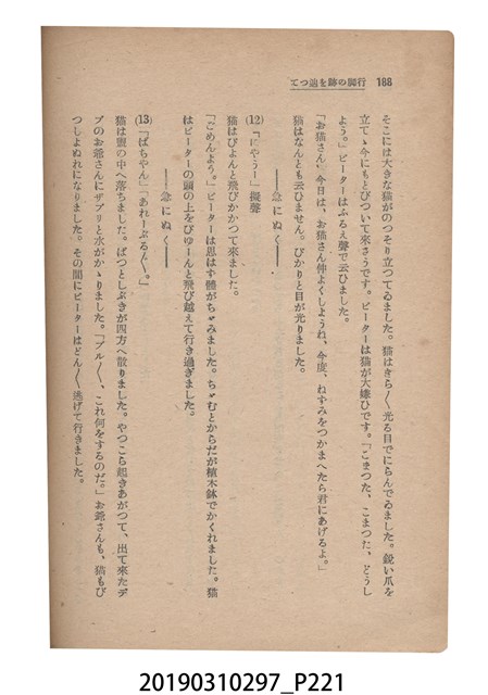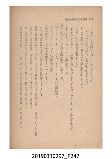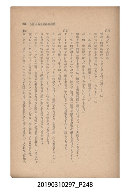 1.本物件為臺南紙芝居研究會發行的《紙芝居演出法》,紙芝居是日文連環圖話劇之意。書本為平裝。封面、封底以上白、下橙為底色,封面上半部以紅字由右而左橫寫「紙芝居演出法」書名,書名下方有黑字「臺灣ニ於ケル其ノ運動」副標題(按:其在臺灣的運動);下半部繪製紙芝居演出圖畫。封底繪製母親帶孩童往廟口觀劇的圖畫。正文前放入數張紙芝居演出情況及相關人士照片;照片頁後為目次;目次後為嘉義專修工業學校長井上德造、臺南師範學校長本田乙之進、臺北帝國大學教授植松安等數人所撰寫的序文及代序。內容包括紙芝居說話技巧之活用、關於紙芝居演出法之理論、有關紙芝居之實演、紙芝居之前置工作、在華麗島和大陸之進行、遵循行腳之跡、放送紙芝居操作、皇紀二千六百年奉祝紙芝居大會、我的活用紙芝居方式等10個部分。正文後附錄日本教育紙芝居協會活動一覽圖。最末頁是版權頁,上載著作、發行、印刷及定價資訊。 2.日本在1920年代,街頭賣糖果零食的商人以紙芝居演出作為招攬生意的方法,大受兒童歡迎,因此紙芝居團在日本快速興起,至1930年代為黃金時代,這股風氣也影響至臺灣。日本教育學者一方面擔憂紙芝居的譁眾取向會對兒童有壞的影響,一方面又看好其啟迪民眾的效用,因而推動紙芝居教材之製作及應用於教學。紙芝居最初運用於幼稚園及低年級教學,內容以童話故事為主。1941年,皇民奉公會附屬團體臺灣紙芝居協會成立,各地亦紛紛設立紙芝居研究會,紙芝居成為皇民化時期宣傳國策的利器,舉凡戰爭動員、鼓勵增產、儲蓄報國等,均一一成為紙芝居演出的主題。