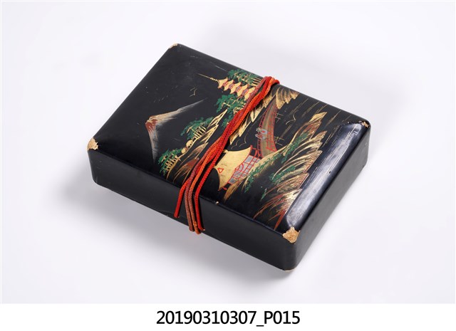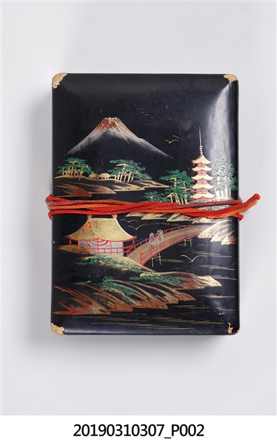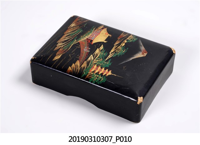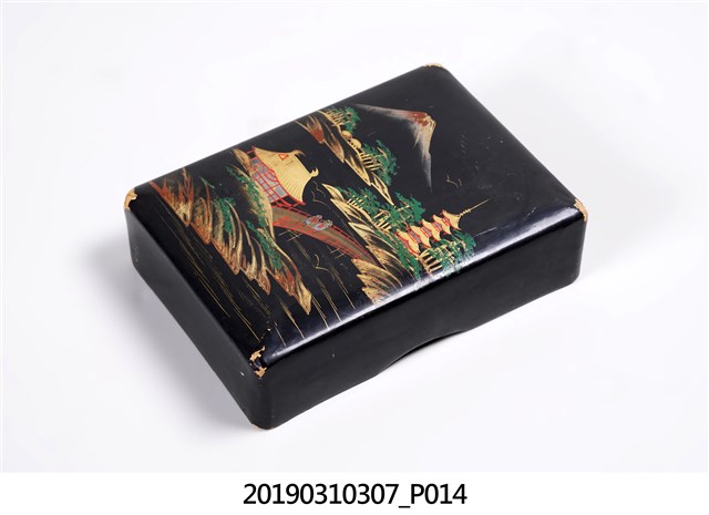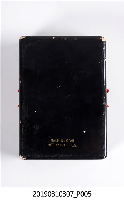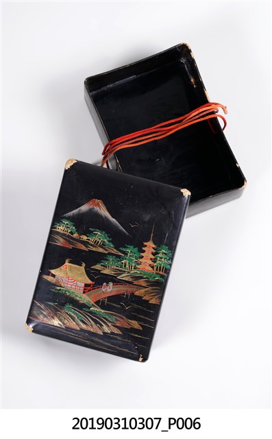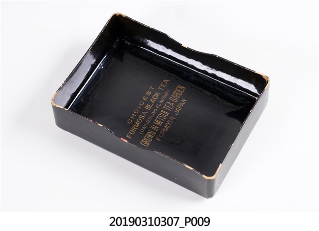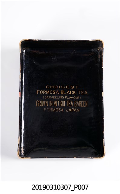 1.本物件為臺灣紅茶漆器盒。為黑色的長方形盒子,正面有富士山和五重塔及寺廟圖案,蓋子裡寫著CHOICEST,FORMOSA BLACK TEA,GROWN IN MITSUI TEA GARDEN 字樣(按:優選臺灣紅茶,種植於三井茶園)。 背面則寫著MADE IN JAPAN及NET WEIGHT 1LB(按:日本製造,淨重1磅)。2.日本領臺之初,臺灣總督府極重視臺灣茶業的發展,對臺北、新竹等主要產茶地區進行茶業調查,並推動臺灣茶業改革。從茶園經營管理的改良、茶業人才的養成、茶業的輔導獎勵、優良茶樹的選種、茶樹栽培與茶葉摘採方法的改良、機械製茶的試驗與推廣、茶業產銷組織的成立、茶葉交易的簡化與合理化、茶葉品管機制的建立、國際茶市場的拓展、茶葉行銷的廣告宣傳,以及臺灣紅茶的發展等。在茶業現代化發展的過程中,除了官方扮演主要的推手之外,民間運用自身的力量投入茶業之改良亦頗有成就,1918年總督府推行茶業獎勵計畫、鼓勵茶農組織茶業組合之,臺北州與新竹州茶產地紛紛成立茶業組合或茶業公司,並進一步組織茶業公司聯合會或茶業研究會,以集體的力量協調地區茶葉之產製,並舉辦各項活動推動茶業改良的工作。3.日治時期,日本當局致力於茶業近代化,許多日本資本投資臺灣茶業。其中,三井物產成立於1876年,隸屬於三井財團,總部設在日本東京日本橋,早在日治初期即涉足臺灣的製糖、樟腦等產業;1909年,三井合名會社(簡稱三井合名)成立,大肆來臺收購茶園及設立製茶廠,至1920、30年代形成由三井合名製茶,三井物產包裝、外銷的情況。三井最初是以烏龍茶銷售為主,1927年以「三井紅茶」為名販售紅茶;1933年,三井創立「日東紅茶」品牌,成為會社紅茶的專屬品牌。